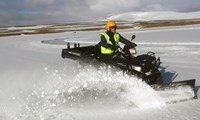 „Bóndabílinn“ væri ég alveg til í að eiga sérstaklega eins og hann var afhentur nýjum eiganda sínum, en þá var búið að setja hann á belti sem eru sérstaklega ætluð til aksturs á snjó, en gagnast líka vel í miklu votlendi. Einnig prófaði ég sexhjól frá Polaris, en vélin í því var ekki nema 570 cc. Þrátt fyrir litla vél vann það vel við að skafa snjó og krapa.