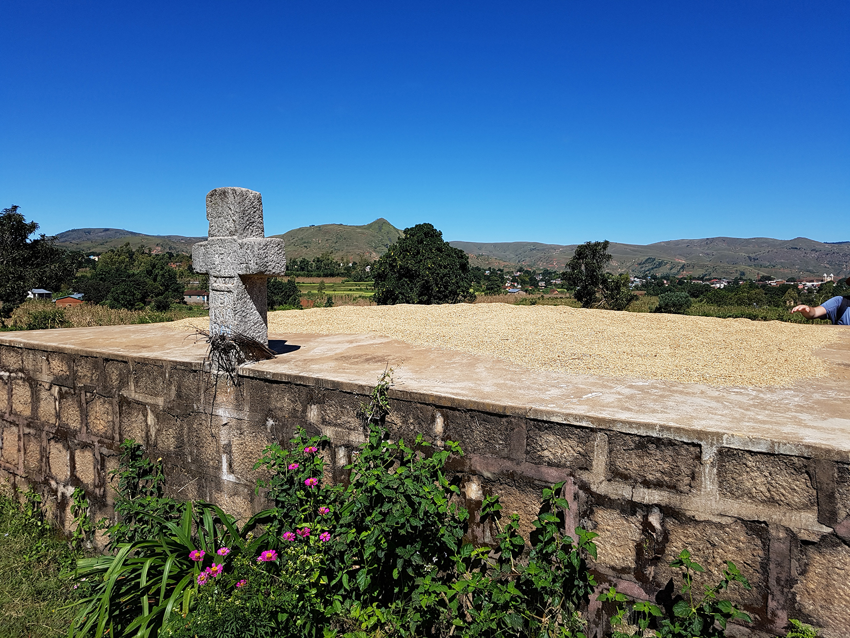Heimamenn nýta hvaða hentugt svæði sem er til að þurrka hrísgrjónin og þar á meðal grafhýsi forfeðranna. Í framhaldi af umræðu um hrís-grjónin og grafhýsin sagði stórgóður leið-sögumaðurinn okkar, Avotra Rabearisoa, að margir íbúar landsins aðhylltust blöndu af kristni og afrískri andatrú. Andar forfeðranna eru í hávegum hafðir enda eru þeir alls staðar nálægir, yfir og allt um kring og öllum fyrir bestu að styggja þá ekki.