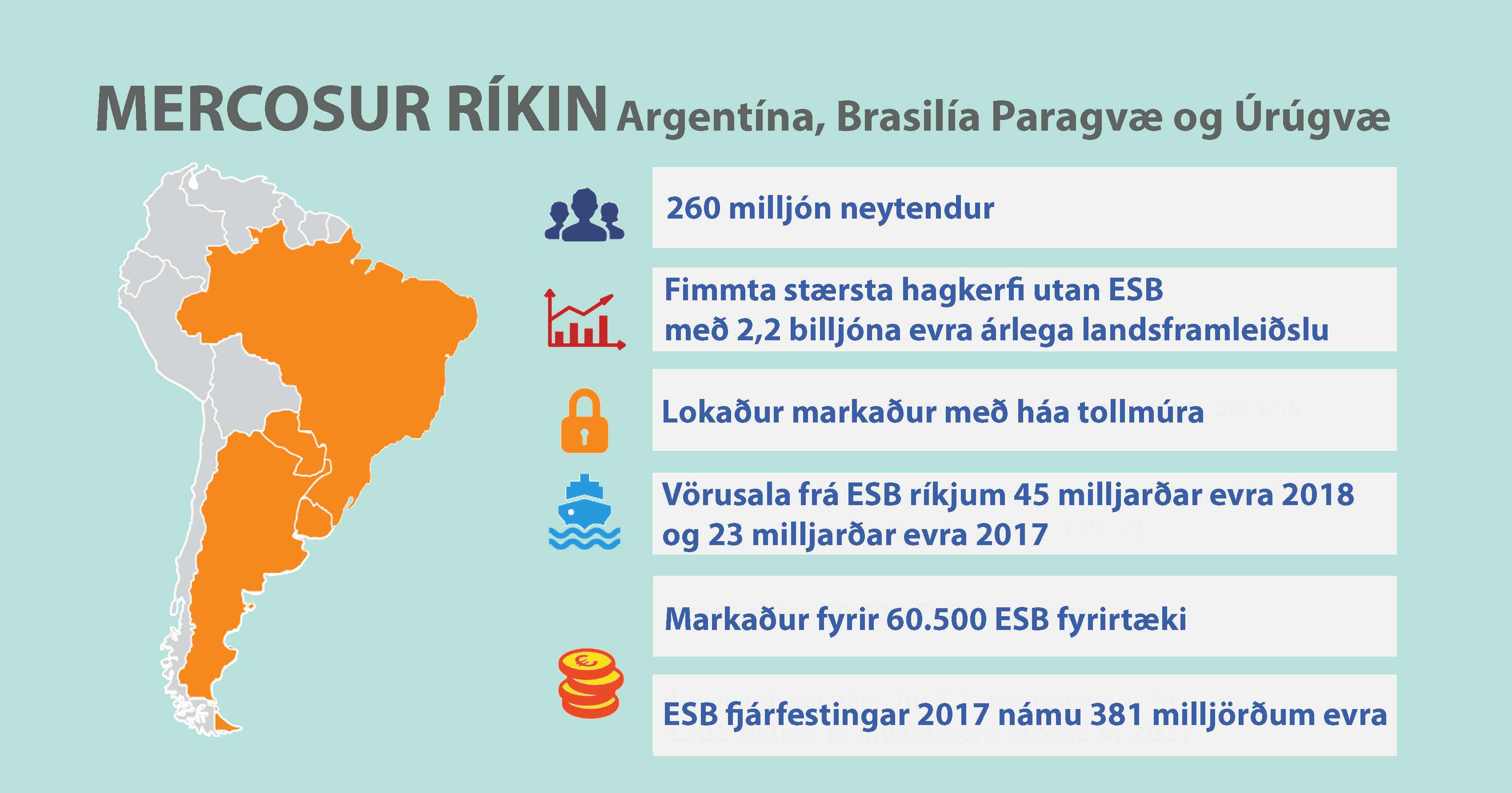 Þá eru fyrirtæki inna Evrópusambandsins öflugust af öllum erlendum fjárfestum innan Mercosur ríkjanna. Þannig var fjárfest af hálfu félaga innan ESB fyrir 52 milljarða evra í þessum Suður-Ameríkuríkjum árið 2017.