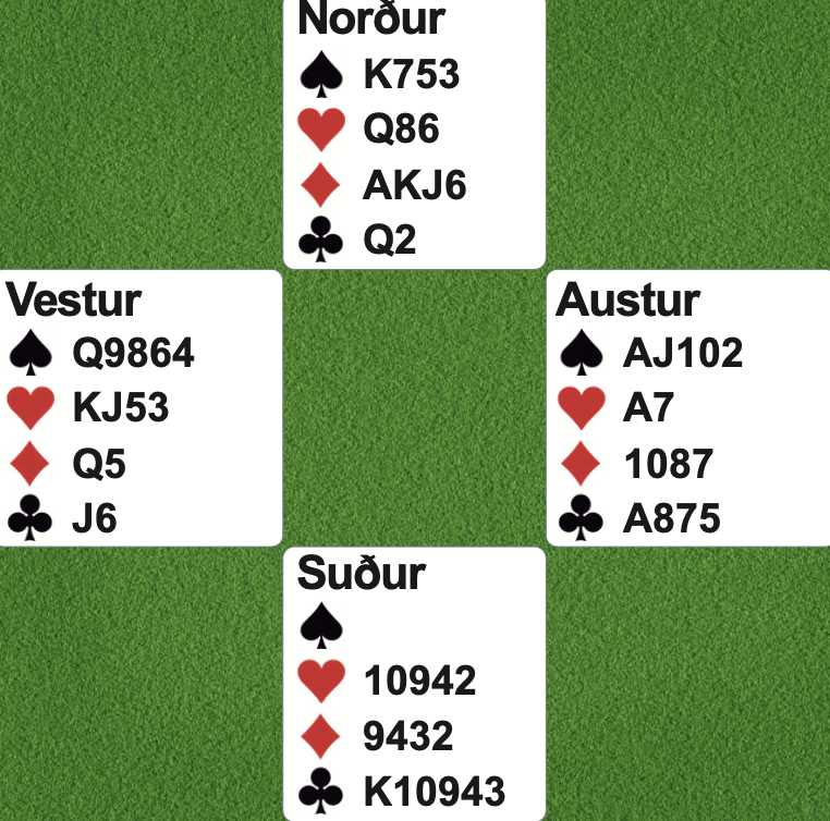 Suður spilaði út laufi. Virtist áhorfendum í fyrstu sem Stefán myndi óhjákvæmilega fara niður á hetjulegum samningum. En hann fann krók á móti bragði.