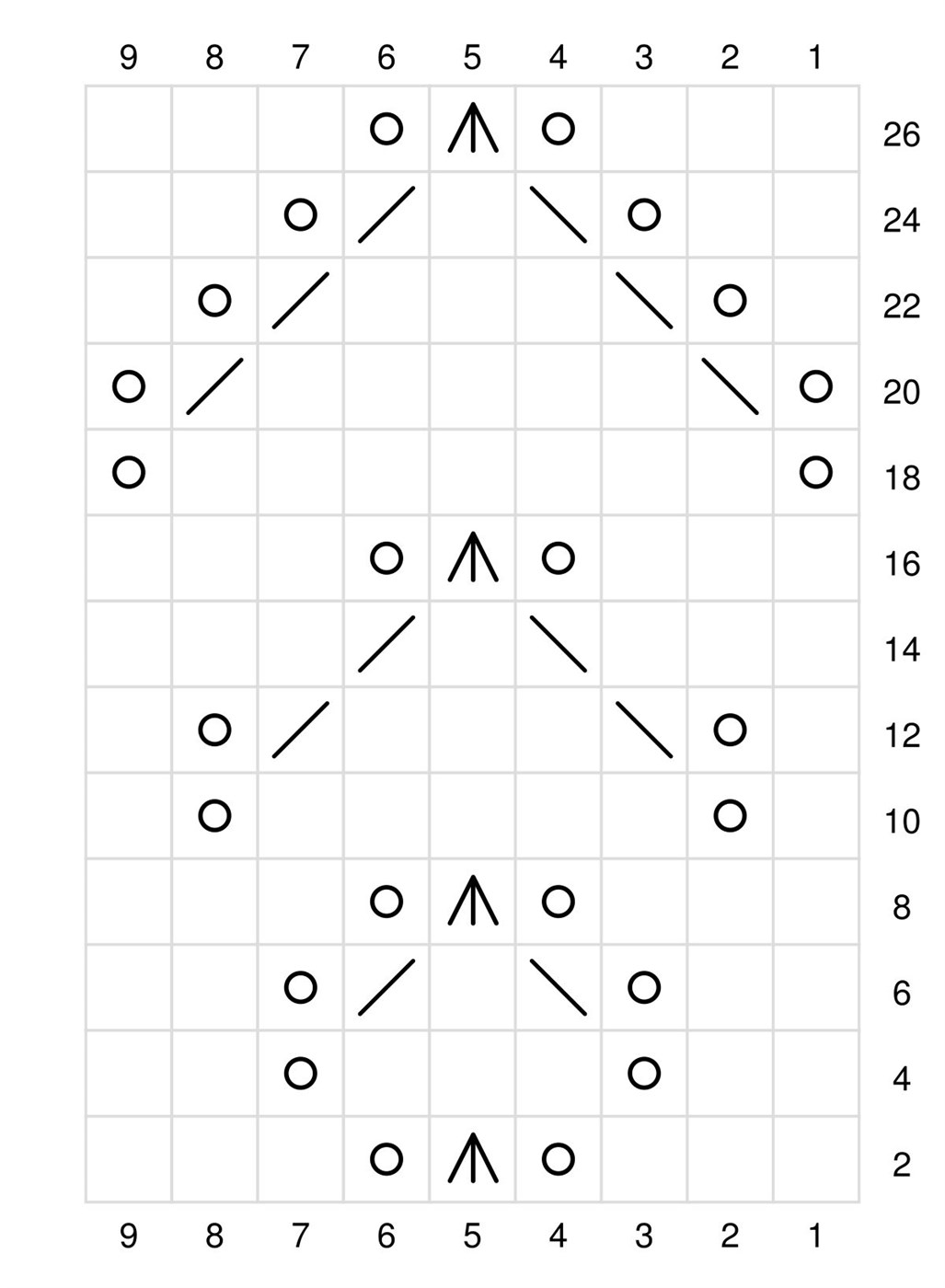 Umferð 2 og allar umferðir frá réttu: 4 Kantl-sl, prjónið skamkvæmt mynsturteikningu (ath: mynsturteikning sýnir bara umferðir frá réttu). Endurtakið mynstur 15 (16) 17 sinnum í umferð, 1 sl, 4 Kantl-sl (= 159 (169) 179 lykkjur þegar mynstri er lokið).