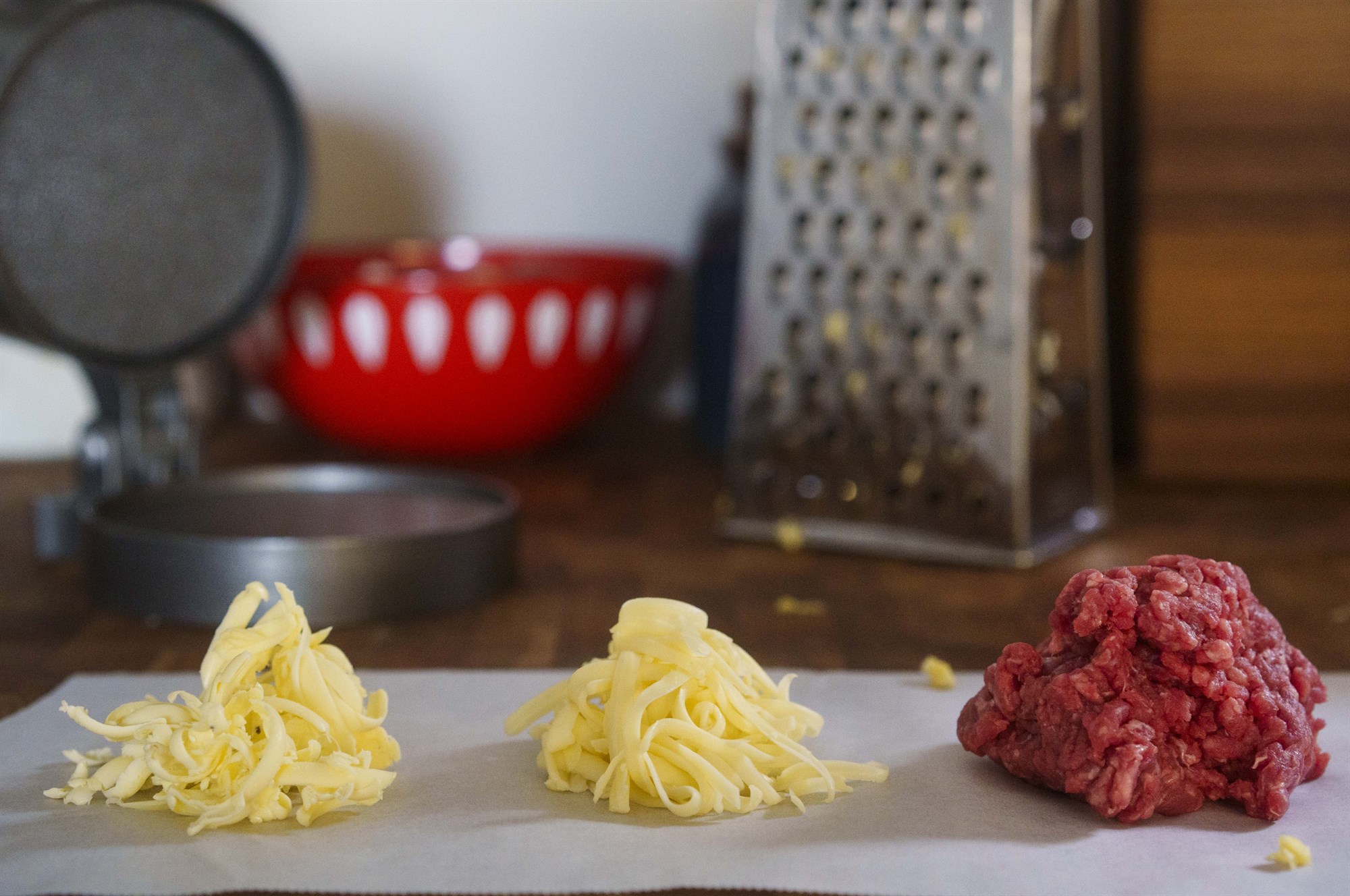 Vandamálið er að bræðslustig smjörs er frekar lágt. Trixið er að frysta smjörklump og rífa hann svo niður með grófu rifjárni. Rífa svo Havartí, Sveitabita eða annan gúmmelaðiost niður og blanda hratt og örugglega við hakk úr kjörbúðinni. Þau sem eiga hamborgarapressu nýta hana en aðrir móta kúlu úr blöndunni og kremja hana með verklegum spaða eða stórri niðursuðudós. Gott að nota stóru Ora Grænar dósina sem var keypt fyrir jólin en gleymdist að nota. Fínt að klippa niður smjörpappír og kremja hakkið á milli pappírslaga.