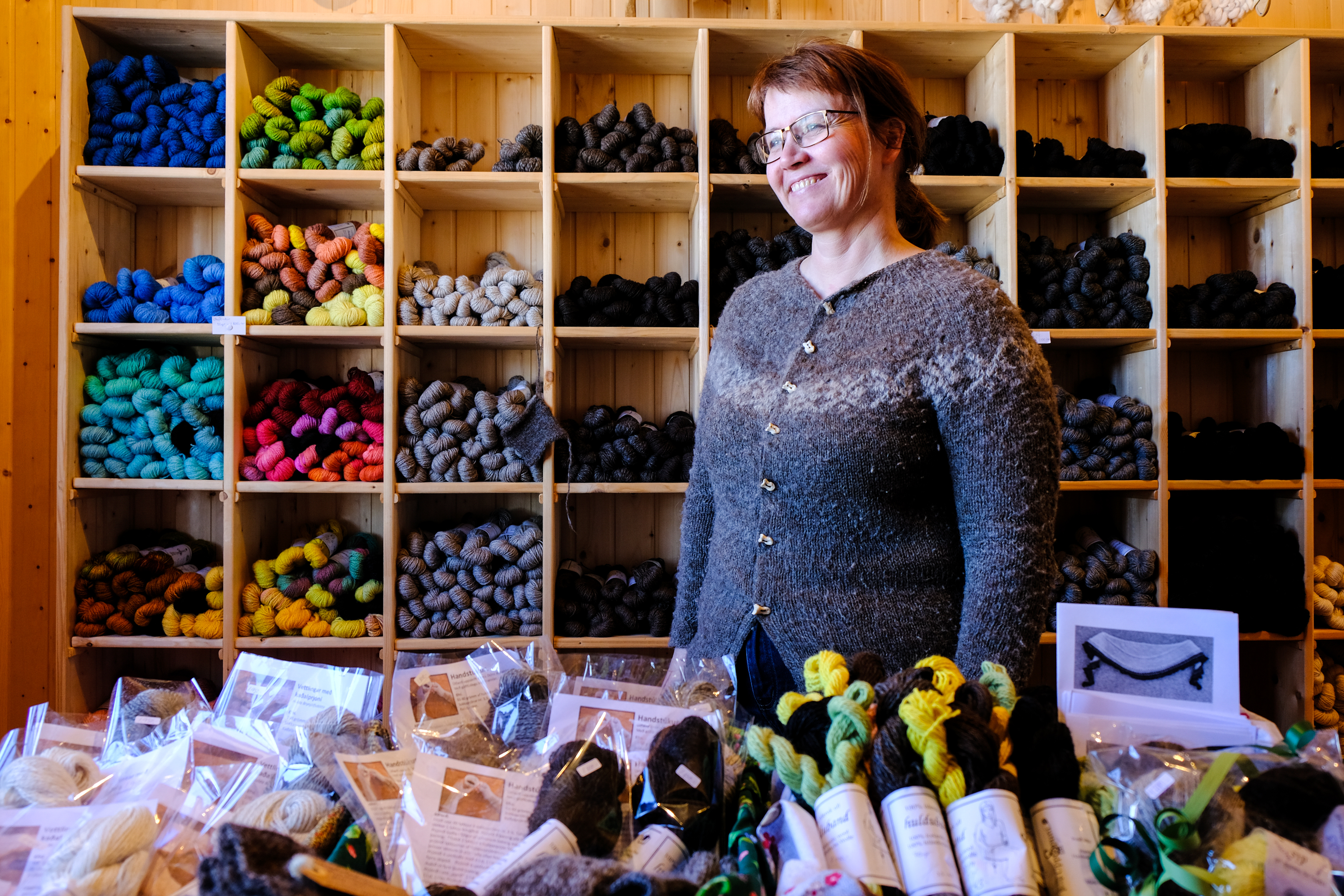 Á efri hæð verksmiðjunnar er snotur verslun þar sem garn og prjónavörur frá Huldu sjálfri er til sölu, en einnig handverk frá öðrum úr héraði. „Við erum bæði með þessa verslun okkar á staðnum en bjóðum líka upp á að senda út á land og við höfum einnig fengið pantanir erlendis frá. Í síðustu viku fengum við meira að segja pöntun frá Ástralíu, ullarlandinu sjálfu, frá þarlendri konu sem komst á snoðir um okkur í gegnum Instagram. Við erum ekki komin með netverslun, þannig að fólk þarf bara að hafa beint samband við mig ef það hefur áhuga á okkar vörum.
