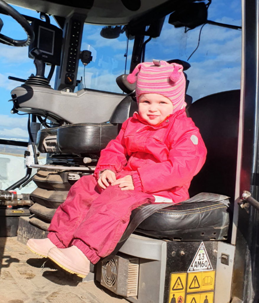 Katrín Rós Gunnlaugsdóttir, dótturdóttir þeirra Hannesar og Kristínar, situr hér kotroskin í dráttarvélinni.
