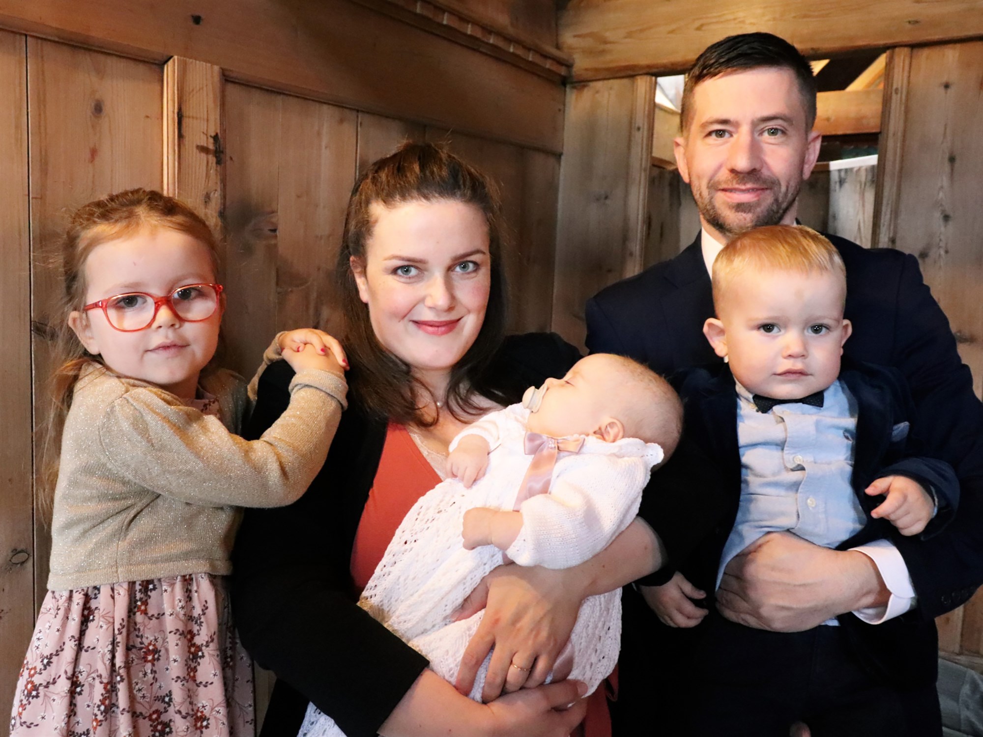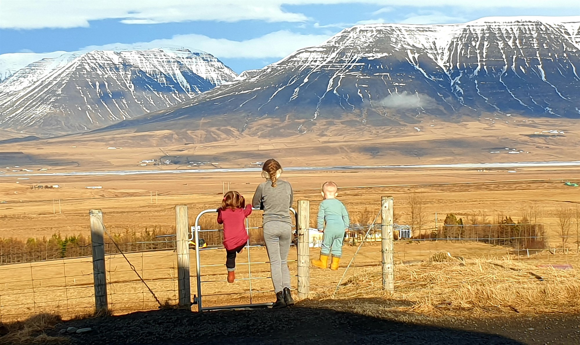 Fjölskyldustærð: Ásamt okkur búa hér börnin okkar þrjú Bríet Lára (f. 2018), Ólafur Ari (f. 2021) og Arna Karítas (f. 2023). Við búum vel að því að hafa foreldra Björns á næsta bæ og elstu systur hans og fjölskyldu á neðri bænum. Mikill sam- gangur er á milli bæjanna. Hundurinn Nói hvílir sig á hlaðinu á milli þess sem hann hrellir póstinn og lætur hrafninn stríða sér.