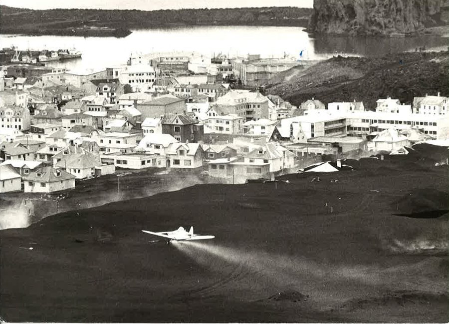 Áburðarflugvélin TF-TÚN að landgræðslustörfum í Vestmannaeyjum eftir gosið 1973.