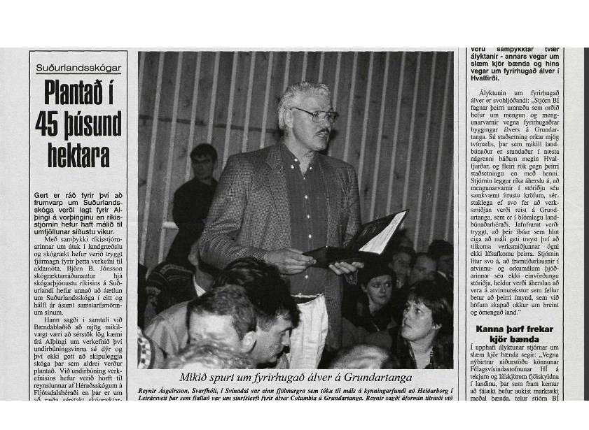 Á myndinni er Reynir Ásgeirsson, Svarfhóli í Svínadal, en hann var einn fjölmargra sem tóku til máls á fundinum. Reynir sagði áformin tilræði við framtíð íslenskra barna og afkomenda þeirra. Sigurbjörn Hjaltason á Kiðafelli beindi meðal annars máli sínu til aðstofaðarforstjóra Columbia, sem sat fundinn. „Það gleði í huga okkar vegna nærveru þinnar en sorg í hjarta vegna fyrirætlana þinna. Þær ógna umhverfi okkar og lýta landið okkar.“