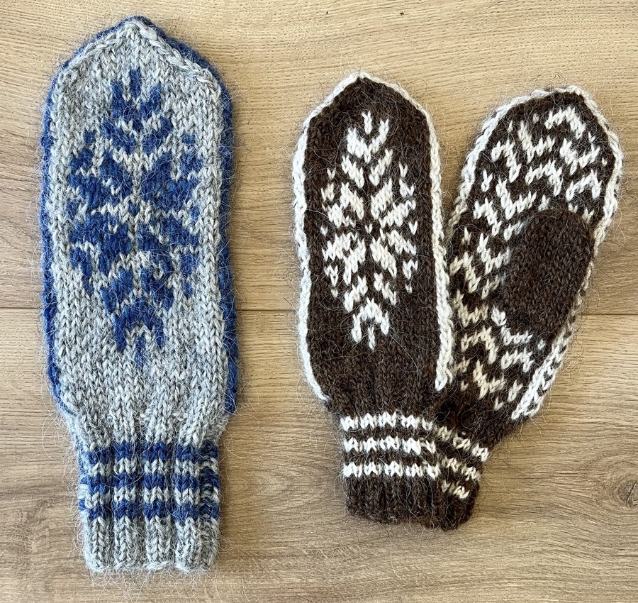 (Herrastærð): Vettlingarnir eru prjónaðir úr tvöföldum plötulopa, ein plata af aðallit og ein af munsturlit. Notast er við sokkaprjóna nr. 4,5 og 5,5. Prjónafesta gefur 14 lykkjur á 10 cm. Vettlingarnir eru nokkuð stórir, ef þú vilt hafa þá minni má notast við prjóna sem er hálfu nr. minni.