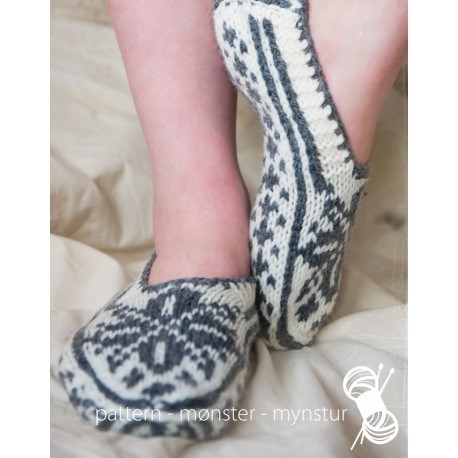 Byrjið að aftan á miðjum hæl. Fitjið upp 13 lykkjur með rjómahvítum. Prjónið fram og til baka í sléttu prjóni eftir munsturteikningu á hæl. Prjónið 14 umferðir, takið nú upp 14 lykkjur meðfram kanti hvoru megin = 41 lykkjur á prjóninum. Haldið áfram að prjóna fram og til bara yfir allar 41 lykkjurnar. Munsturteikning sýnir allar lykkjurnar en fyrstu 4 og síðustu 4 lykkjurnar eru alltaf prjónaðar slétt (garðaprjón). Þegar prjónaðar hafa verið 24 umferðir eftir að lykkjur voru teknar upp á hæl, fitjið upp 5 lykkjur (ofan á fæti/rist) og prjónið nú í hring. Haldið áfram að prjóna eftir munsturteikningu. Fellið af eins og teikning sýnir = 18 lykkjur eftir á prjóninum, slítið bandið frá og dragið í gegnum lykkjurnar sem eftir eru.