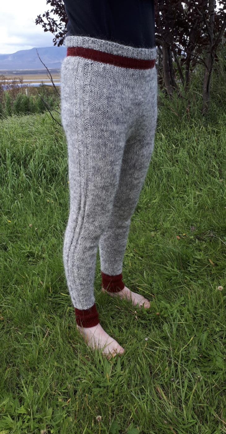 Meginefnið í buxurnar er einn þráður einband og einn þráður plötulopi sem eru prjónuð saman. Annað band sem stingur ekki eins mikið er notað í teygjugang og neðst á skálmar, til dæmis Spuni frá Ístex.