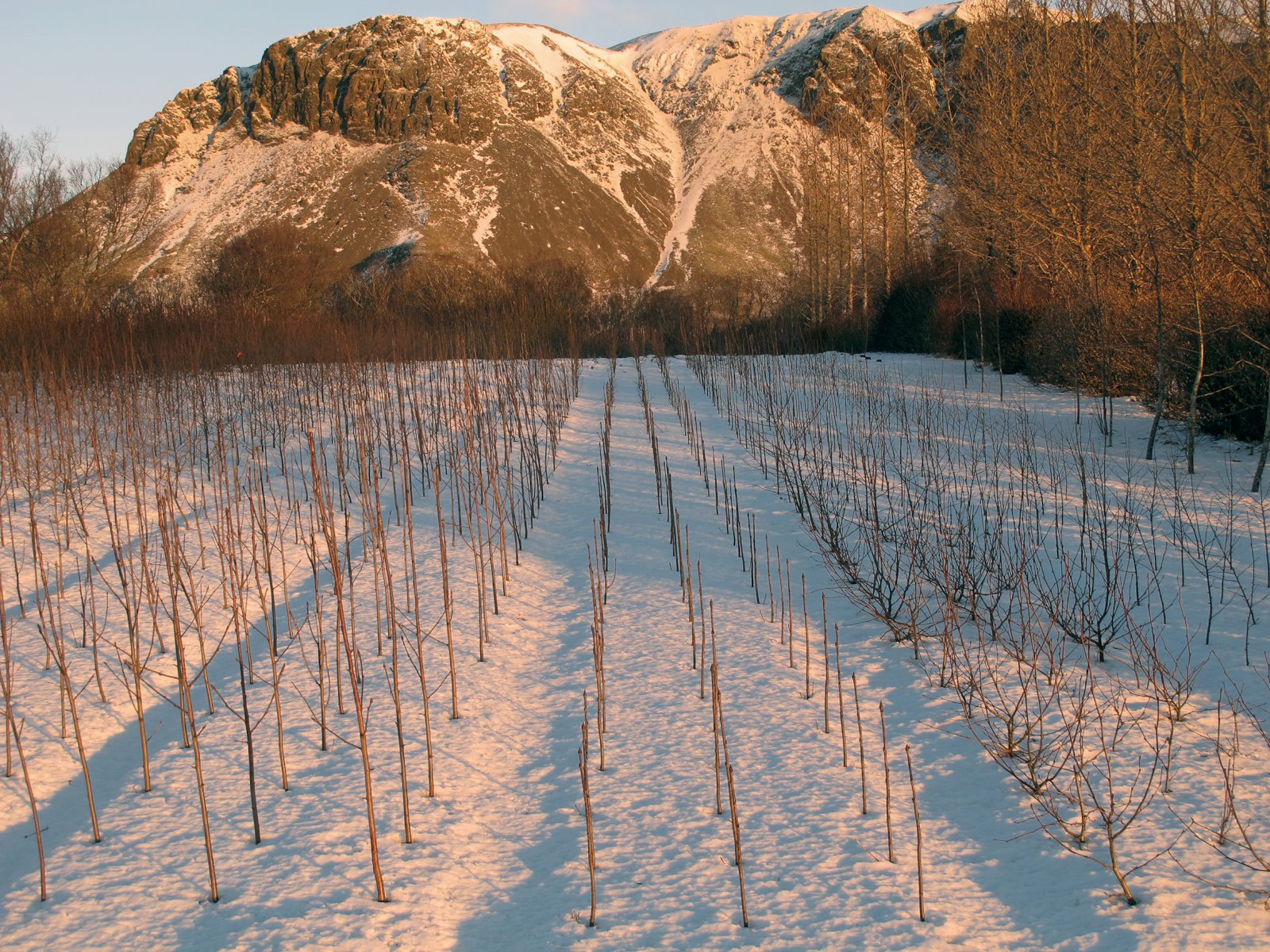 Í skjóli trjánna undir vindbörðu fjalli Ingólfs