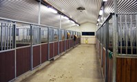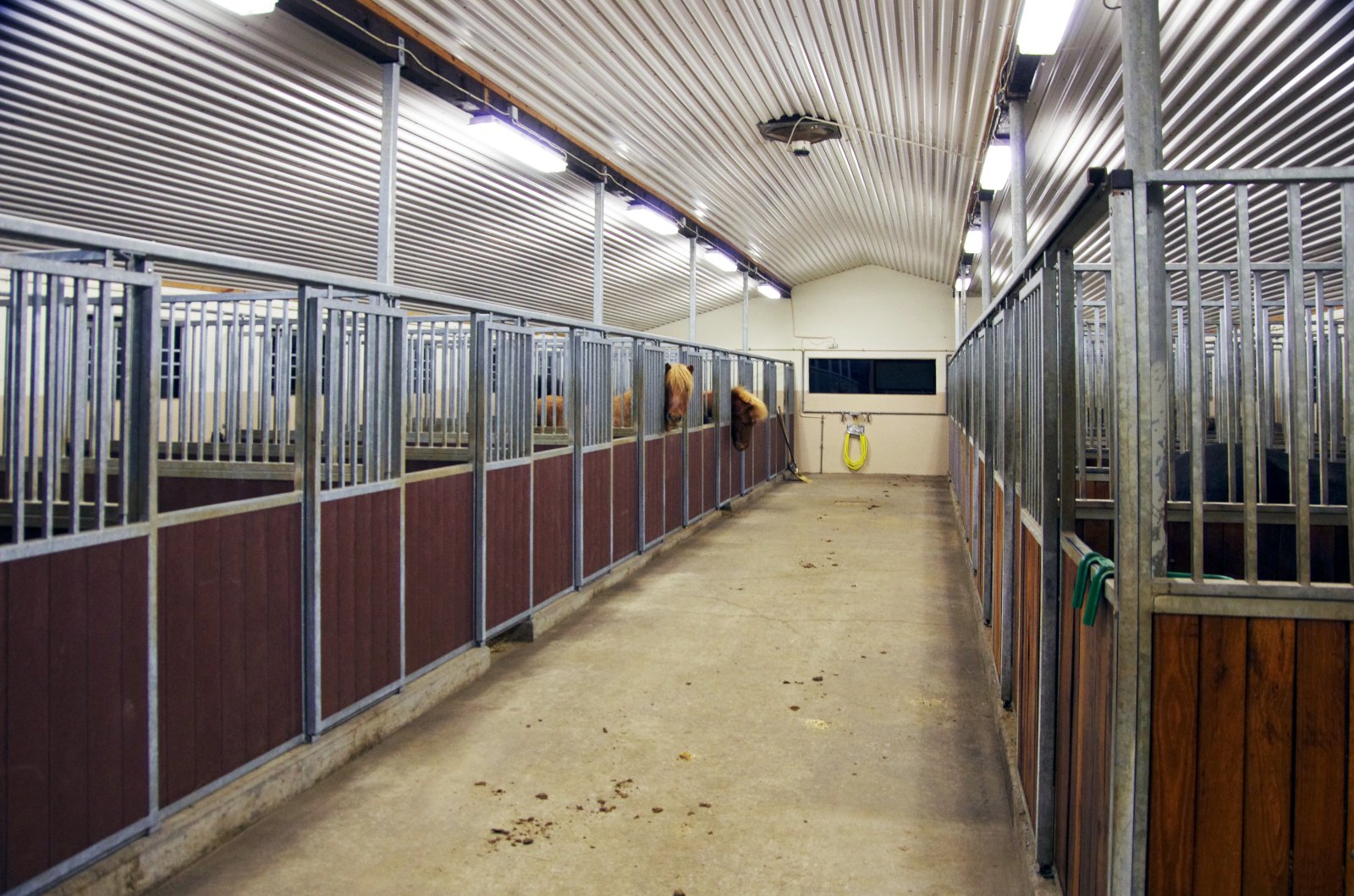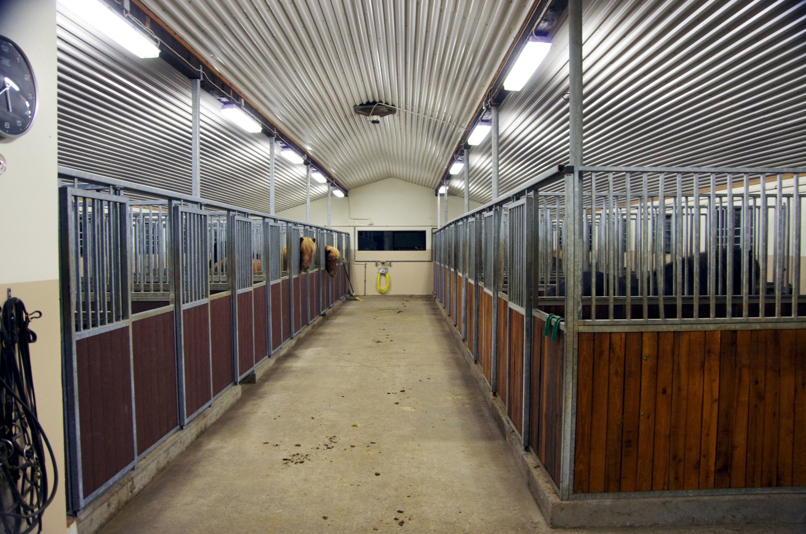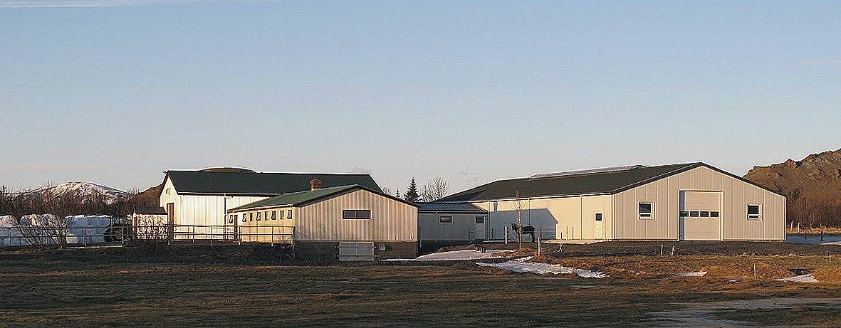 Helgi er stoltur af reiðskemmunni sem er 16x40 metra límtréshús, eða 640 fermetrar að grunnfleti. Það er byggt af Límtré á Flúðum, eða Límtré Vírnet ehf., eins og fyrirtækið heitir í dag. Þeir teiknuðu einnig millibygginguna sem tengir skemmuna við hlöðuna.