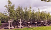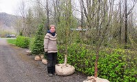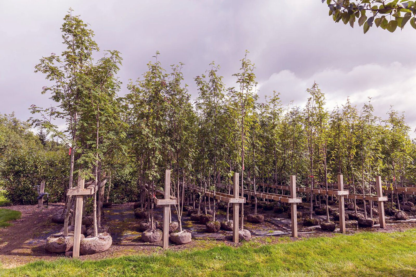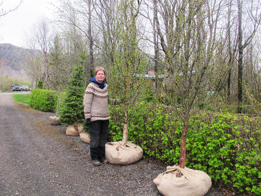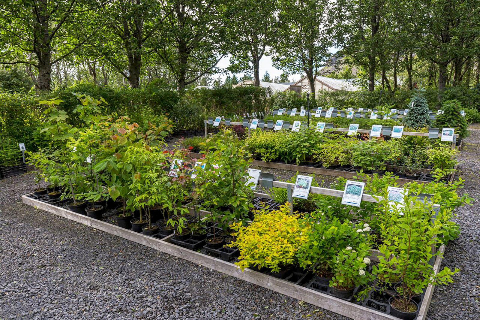 „Við erum að framleiða hér tré, skrautrunna, limgerðis- og skjólbeltaplöntur. Trén sem við erum að selja eru alveg upp í þriggja til fjögurra metra há. Hnausaplönturæktun er svolítið okkar sérgrein í trjáræktinni,“ segir Helga. Þar á hún við að trén eru undirbúin í uppeldinu til flutnings síðar og þá seld í hnaus sem er íklæddur striga sem auðveldar mjög allan flutning. Framleiðsluna sýna þau á stóru útisvæði yfir sumarið. Þar eru allar plönturnar vel merktar samkvæmt ákveðnu merkingakerfi sem garðplöntuframleiðendur hafa látið útbúa fyrir sig. Framleiðsluna selja þau síðan á staðnum beint til viðskiptavina.