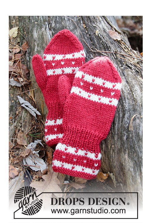 Fitjið upp 28 (32) 36 (36) 40 lykkjur á sokkaprjóna nr 3 með vínrauðum. Prjónið 4 umferðir garðaprjón (= 2 garðar). Skiptið yfir á sokkaprjóna nr 3,5 og prjónið mynstur hringinn eftir mynsturteikningu A.1. Prjónið A.1, 1 sinni á hæðina. Skiptið yfir á sokkaprjóna nr 3 og prjónið stroff (1 slétt, 1 brugðin) alls 3 (3) 4 (4) 4 cm. Skiptið til baka yfir á sokkaprjóna nr 3,5 og prjónið slétt 3 (5) 5 (7) 9 umferðir. Byrjið útaukningu fyrir þumalop og aukið er út 1 lykkju hvoru megin við aðra lykkju í umferð – sjá ÚTAUKNING. Aukið svona út í annarri hverri umferð alls 3 (3) 4 (4) 4 sinnum (aukið er út báðum megin við allar þumal lykkjur, þ.e.a.s. það verða 2 lykkjur fleiri á milli uppslátta í hvert sinn sem aukið er út). Eftir allar útaukningar eru 7 (7) 9 (9) 9 þumallykkjur og 34 (38) 44 (44) 48 lykkjur á prjóninum. Þegar vettlingurinn mælist 10 (11) 12 (12) 13 cm (stykkið mælist ca 3 (4) 4 (5) 5 cm frá stroffi), setjið 7 (7) 9 (9) 9 þumal lykkjur á þráð. Fitjið upp 1 lykkju yfir lykkjur af þræði = 28 (32) 36 (36) 40 lykkjur á prjóninum. Prjónið nú mynstur A.2. þar til vettlingurinn mælist ca 15 (16) 18 (19) 21 cm (stykkið mælist ca 8 (8) 9 (11) 13 cm frá stroffi). Nú eru eftir ca 3 cm til loka, mátið e.t.v. vettlinginn og prjónið að óskaðri lengd – ATH: Endið eftir heila rönd með natur og prjónið með vínrauður (án «doppa») að réttu máli.