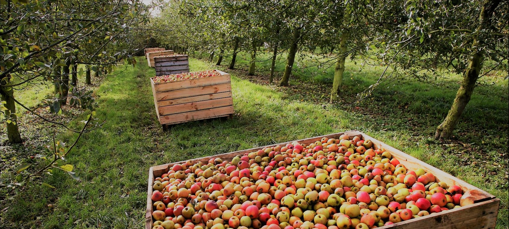 Þegar kemur að perutrjám fyrir Domfrontais og eplum fyrir Pays d’Auge er bilið meira og því færri tré á hektara og uppskeran minni. Eplin og perurnar eru tínd í september og fram í nóvember eftir yrkjum og eftir því sem aldinin þroskast og því tínt af hverju tré oftar en einu sinni.