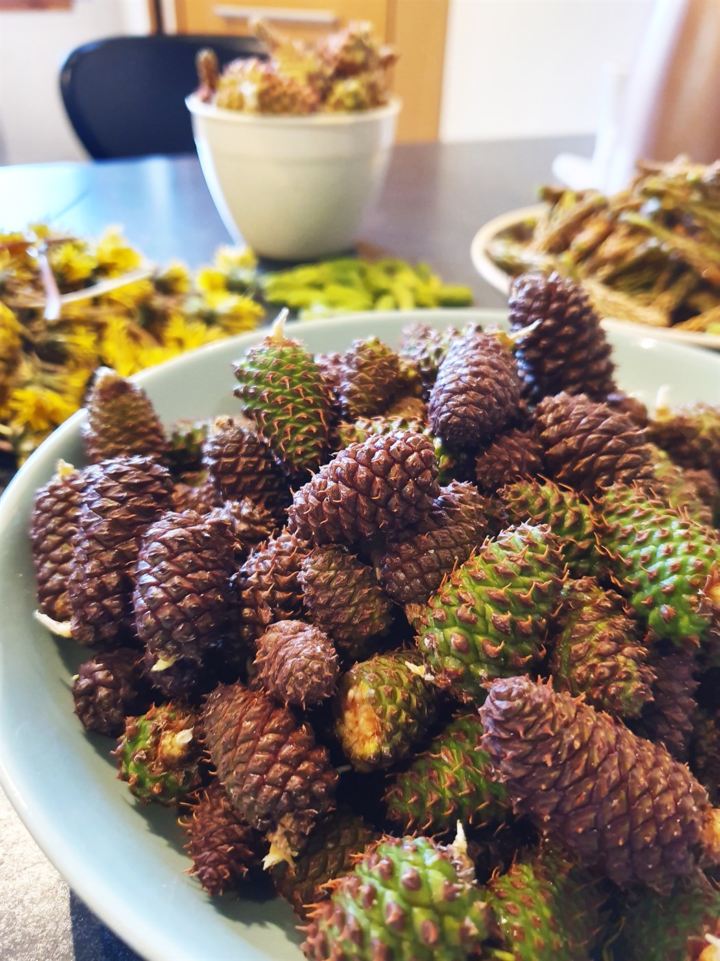 Nokkar afurðir sem unnið var með í þróunarstarfi undanfarin tvö ár, könglar, fífill og fleira.
