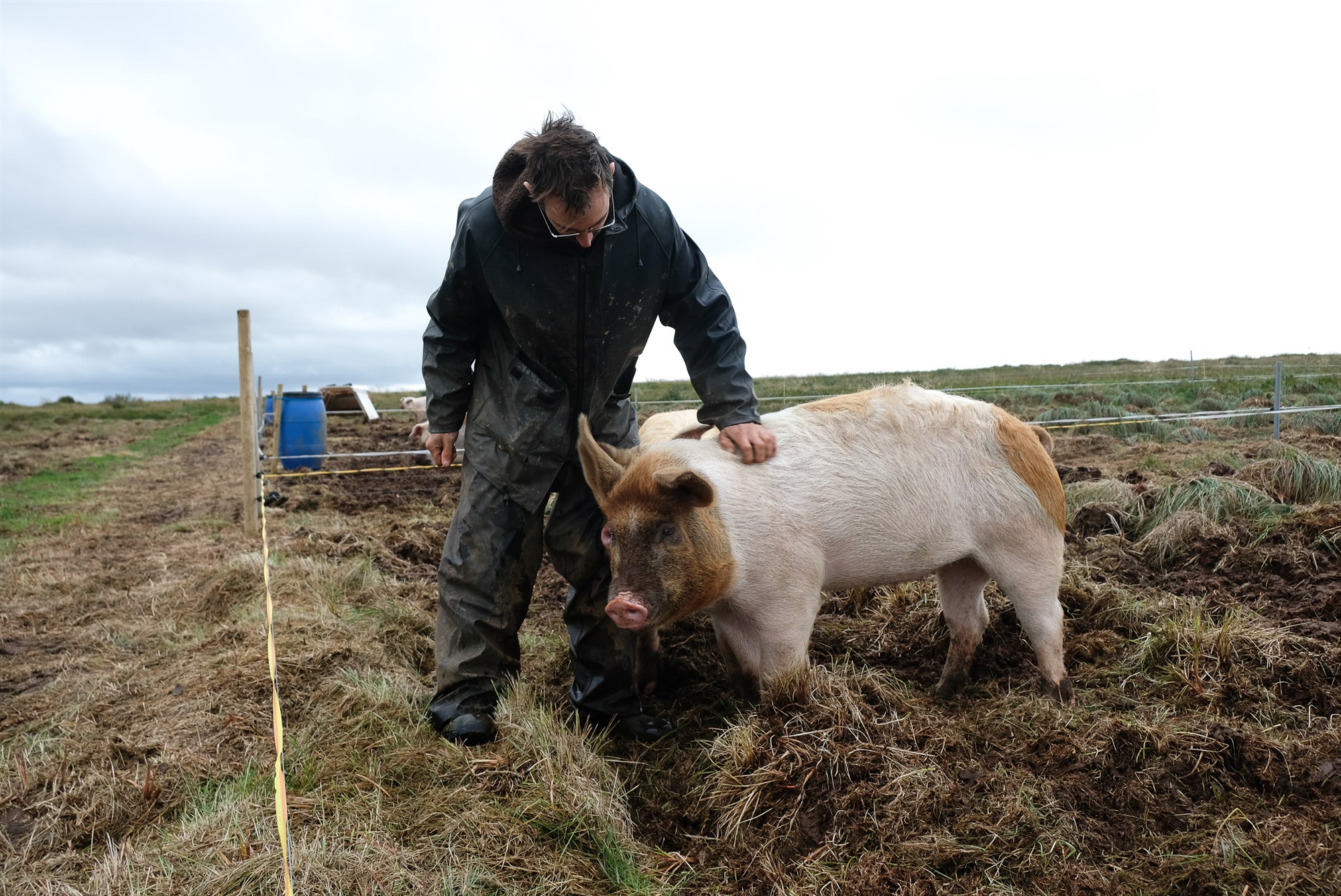„Fyrsta árið einbeitum við okkur að þeim tegundum sem við höfum náð góðum árangri með í Sviss – og við erum komin með fimm svín sem við ætlum að nota til kjötframleiðslu. Við fengum þau í mars og vorum fyrst í stað með þau inni í gróðurhúsinu en hleyptum þeim svo út þegar veður leyfði en við erum með gott landrými fyrir slíkan búskap, því landið er alls um 28 hektarar.“