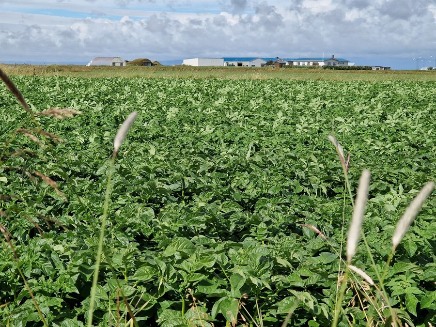 Kartöflugarður í fullum vexti í Þykkvabæ. Kartöflubúið Skarð í bakgrunni. Flest kartöflubúin í þorpinu eru 25 til 30 hektarar, sem er sú stærð sem hentar tveimur einstaklingum best.