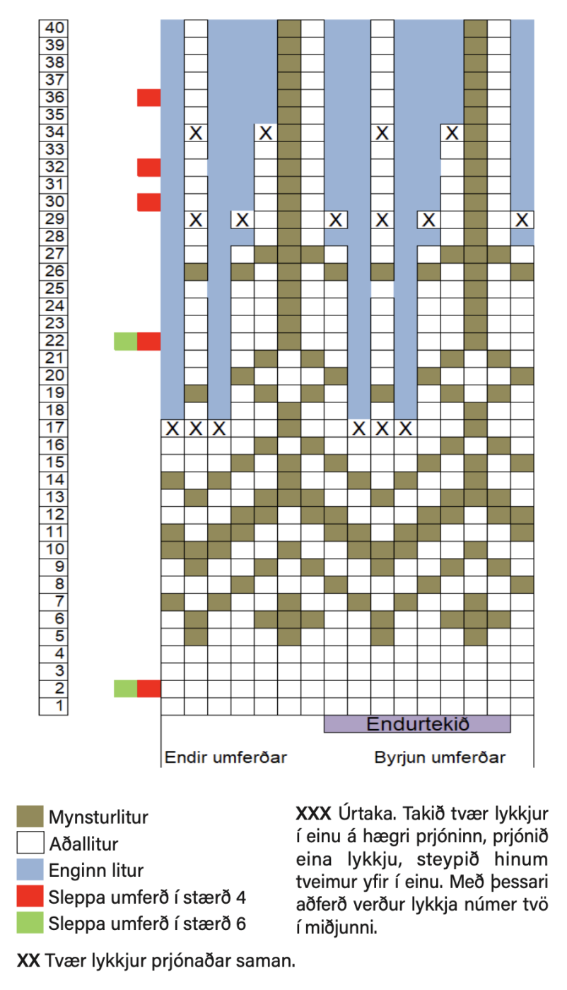 Notið styttri hringprjóninn þegar lykkjum fækkar. Þegar mynstri er lokið er tekið úr aukalega jafn yfir umferð þar til 64-68-72 lykkjur eru á prjóninum. Prjónið hálsmál 4 umferðir stroff og 3 umferðir sléttar og hafið slétta prjónið með mynsturlit. Fellið af frekar laust.