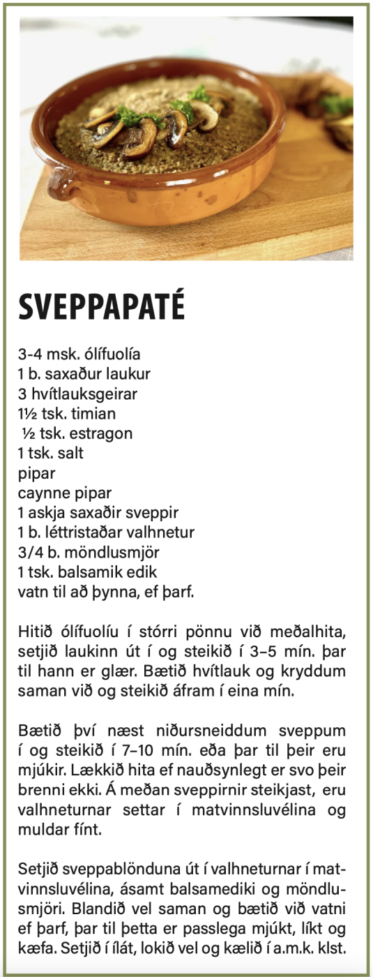„Sveppirnir eru svo eitthvað sem við tínum árlega, þá helst kúalubba og lerkisveppi. Kúalubbana nota ég í sveppapaté, sem er ægilega vinsælt og gott. Svo þegar ég elda fyrir útlendinga sem eru gjarnan í fjallgöngum – þá set ég þeim fyrir að læra að þekkja kúalubbana, tína þá og svo elda ég úr þeim. Þetta er borðað með bestu lyst enda gaman að borða það sem maður sækir sjálfur. Þá annaðhvort geri ég paté eða steiki sveppina úr smjöri, með eplum og balsamik, sem er hrikalega góð samsetning.