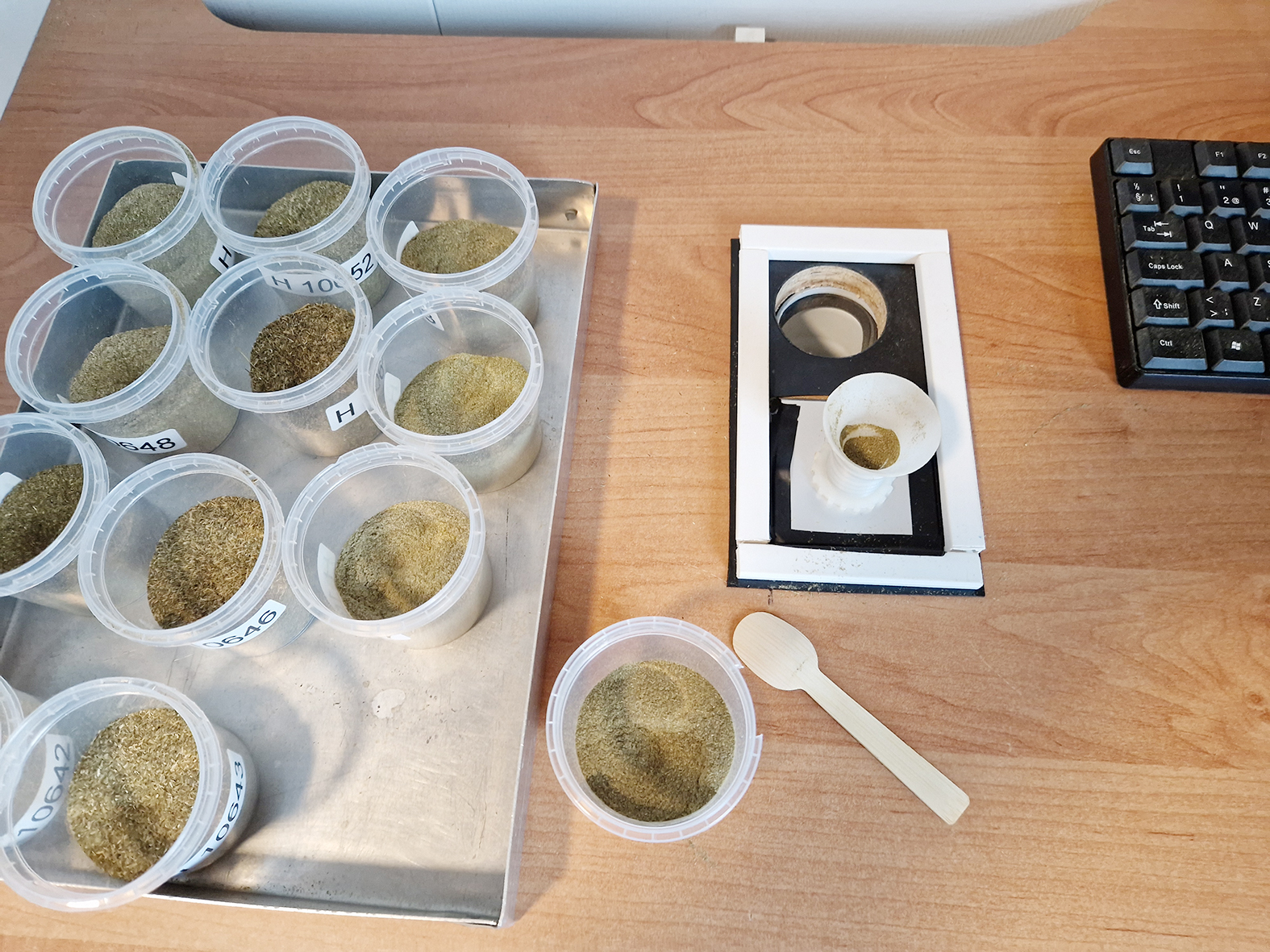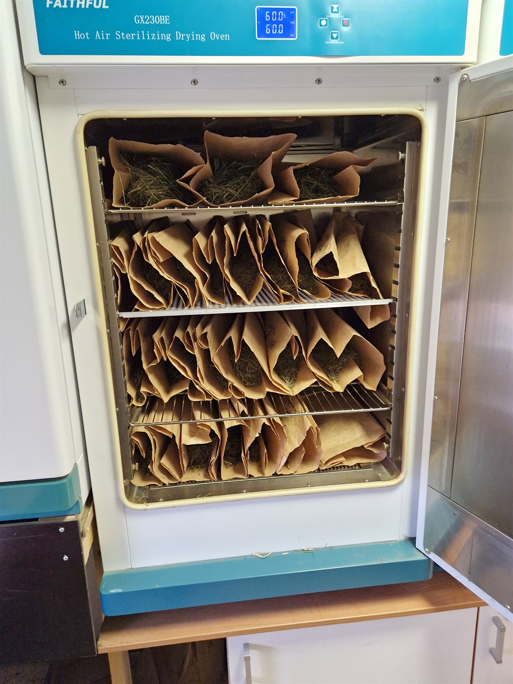 Eftir að Elísabet tekur við heysýnum í loftþéttum plastpokum vigtar hún hluta heysins og setur í opna bréfpoka. Jafnframt er sýnunum gefið raðnúmer strax í upphafi sem fylgir því í gegnum allt ferlið. Hluti sýnisins er geymdur í nokkrar vikur í frysti – ef eitthvað kemur upp á. Bréfpokarnir fara í þurrkunarofn og heyið er þurrkað í tvo daga við 60 °C. Þegar pokarnir koma úr ofninum hefur allur rakinn gufað upp, því er hægt að sjá hvert þurrefnisinnihaldið var í upphafi með því að vigta sýnin aftur. Þurrt heyið er malað og er skipt niður fyrir nokkrar mismunandi mælingar.
