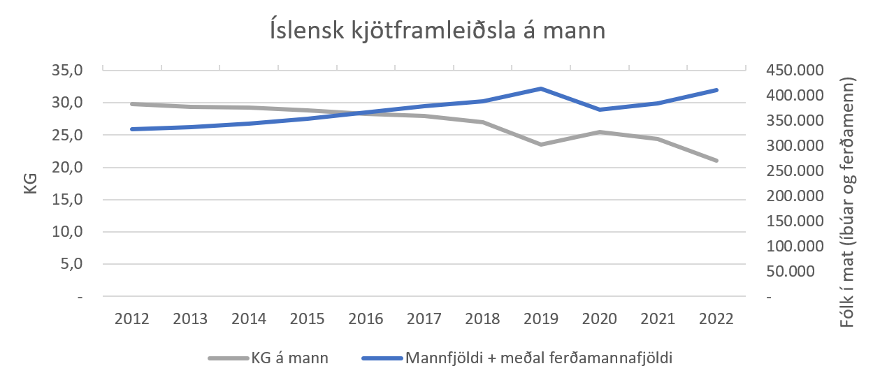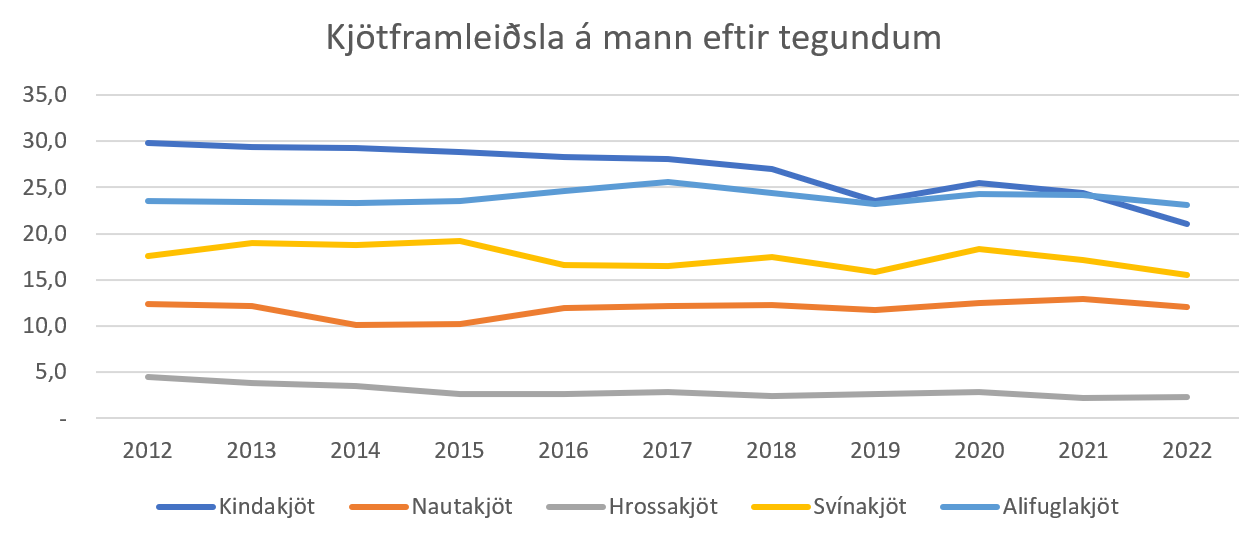 Mestu munar um samdrátt í sauðfjárrækt. Framleiðsla kindakjöts á mann dróst saman um rétt tæp 30% frá árinu 2012 og fram yfir árið 2022. Hrossakjötsframleiðsla dróst saman um 40% og svínakjötsframleiðsla um 12%. Framleiðsla allra tegunda jókst annaðhvort árið 2020 eða 2021 í kjölfar fækkunar ferðamanna á landinu en hefur svo fallið aftur.