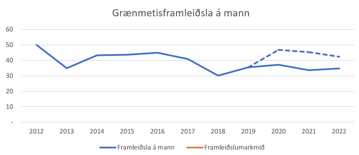Í endurnýjun búvörusamnings um grænmetisrækt árið 2020 var lagt fram markmið um að auka ræktun grænmetis á Íslandi um 25% frá meðal framleiðslu þriggja ára þar á undan. Háleitt markmið sem, aftur, hefur skírskotun í bæði fæðuöryggis- og umhverfissjónarmið. Frá þeim tíma hefur heildarframleiðsla nokkurn veginn staðið í stað og þar með dregist saman á hvern einstakling. Árið 2022 var framleiðsla á mann, af þeim tegundum sem til eru opinberar tölur um, 35 kg. Er það 15 kg samdráttur frá 2012. Jafnvel þótt markmið um 25% aukningu frá meðalframleiðslu áranna 2017 til 2019 hefði náðst væri framleiðslan enn töluvert undir framleiddu magni ársins 2012.