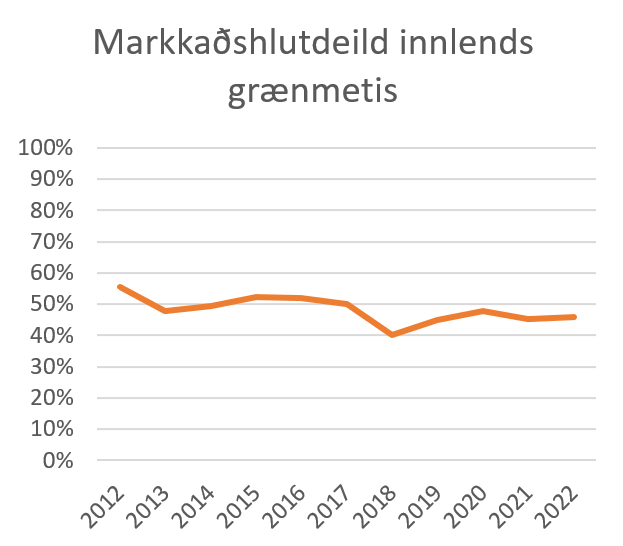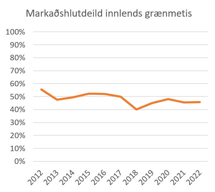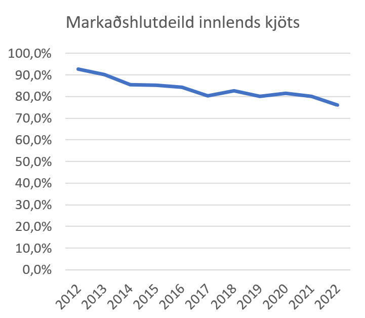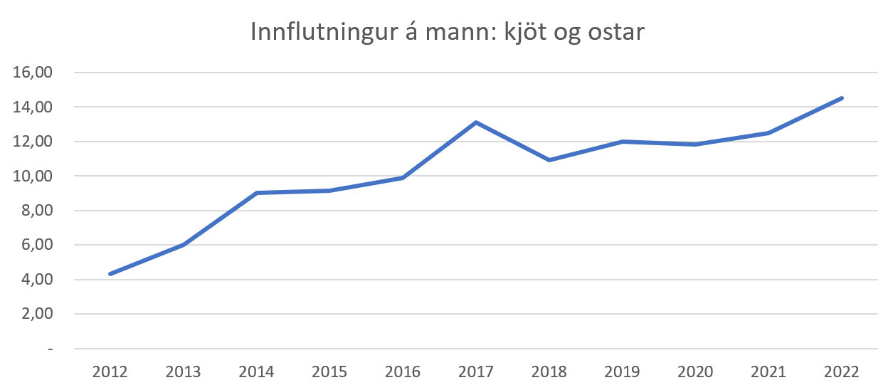 Samhliða þessum samdrætti í framleiðslu á mann hefur innflutningur aukist. Árið 2022 voru flutt inn til landsins tæplega 14,5 kg af kjöti og ostum á mann. Er það meira en þreföldun frá árinu 2012 og féll markaðshlutdeild innlendrar kjötframleiðslu til að mynda úr 92,7% niður í 76,1%. Yfir sama tímabil féll markaðshlutdeild innlends grænmetis úr 55% í 46%.