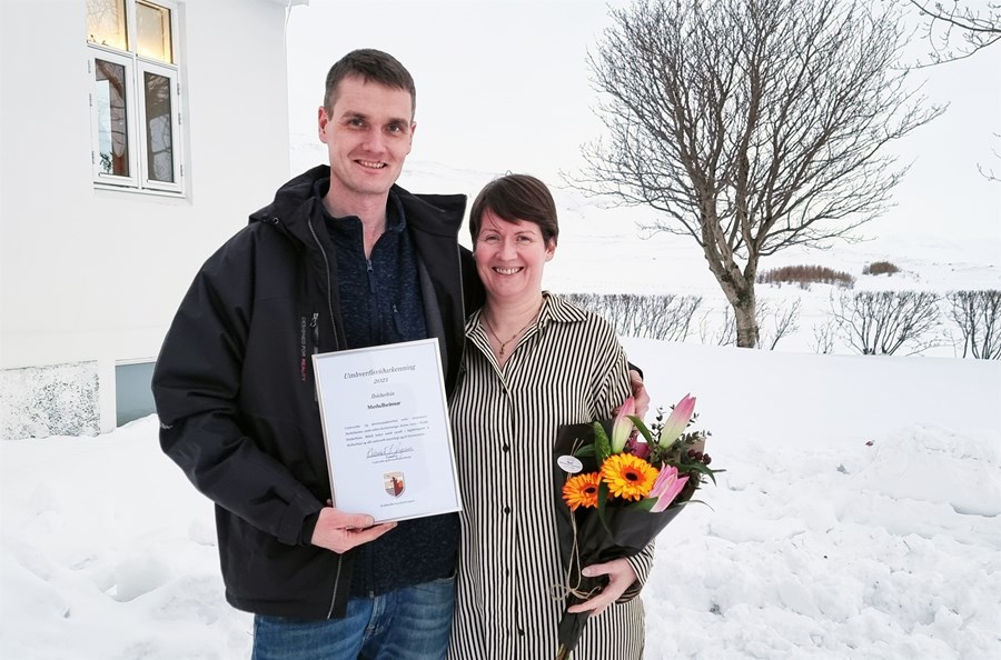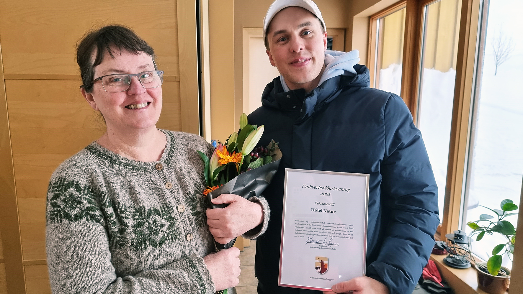 Inga Margrét Árnadóttir og Þórir Steinn Stefánsson hjá Hotel Natur glöð með sína umhverfis- viðurkenningu.