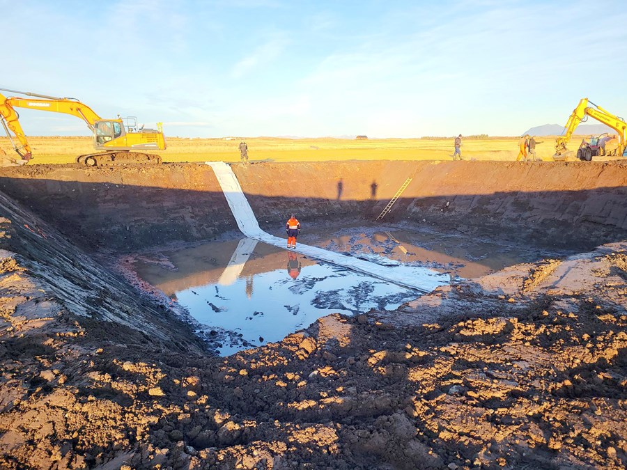 Um 500 metrum frá fjósinu var grafin hola samkvæmt GPS mælingum sem var klædd tilsniðnum dúk. Erlendis er þessi geymsluaðferð útbreidd, en þetta er líklegast í fyrsta skipti sem mykjulón af þessu tagi er sett upp á Íslandi.