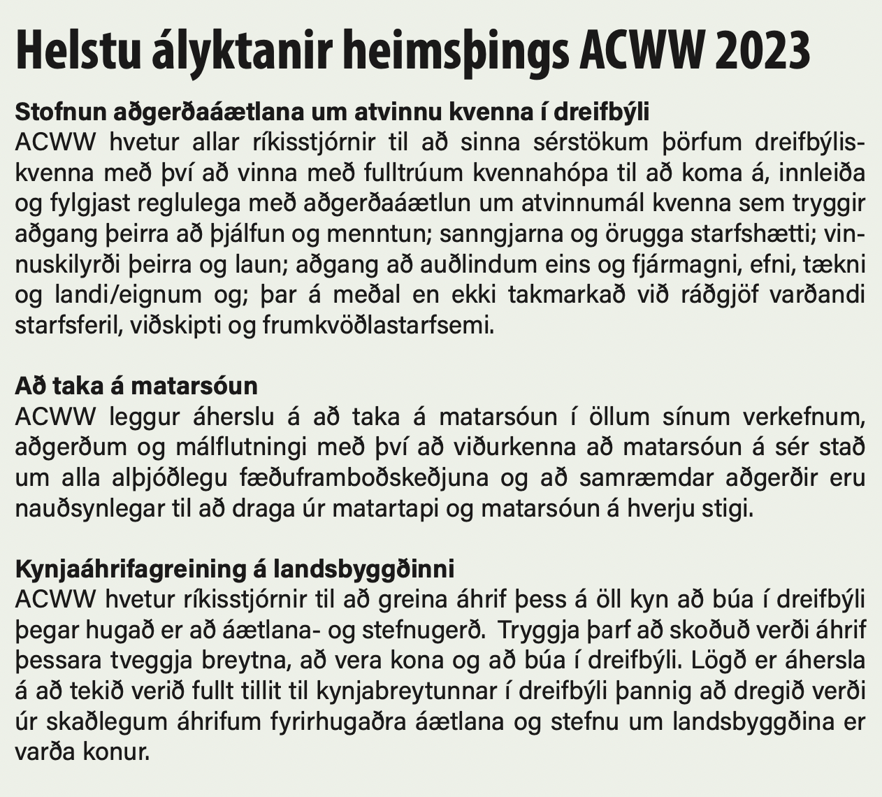 Aðspurð um hvað íslensku þátttakendurnir taki með sér heim, íslenskum dreifbýliskonum til handa, segir Jenný áherslu þingsins hafa verið á konur í dreifbýli í fátækustu löndum heims.