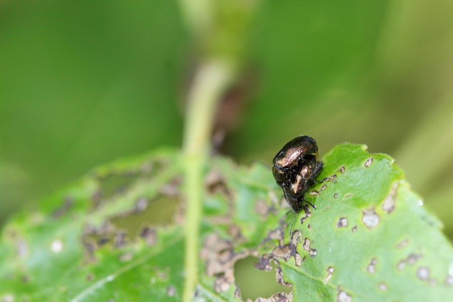 Svona lítur fullorðin asparglytta út á laufblaði aspar, en þær valda miklum skaða á trjánum.