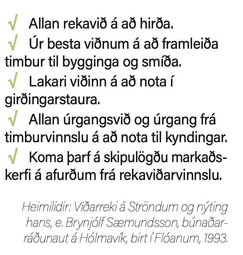 Jafnframt kemur fram að nær allur eldri reki hafi verið nýttur á stórum svæðum og óðum styttist í að þar verði einungis um nýjan reka að ræða. Gera megi ráð fyrir að rekaviður skemmist um 10% á ári við að liggja óhreyfður í hirðuleysi á rekanum. Þannig sé tíu ára gamall viður og eldri vart nýtanlegur.