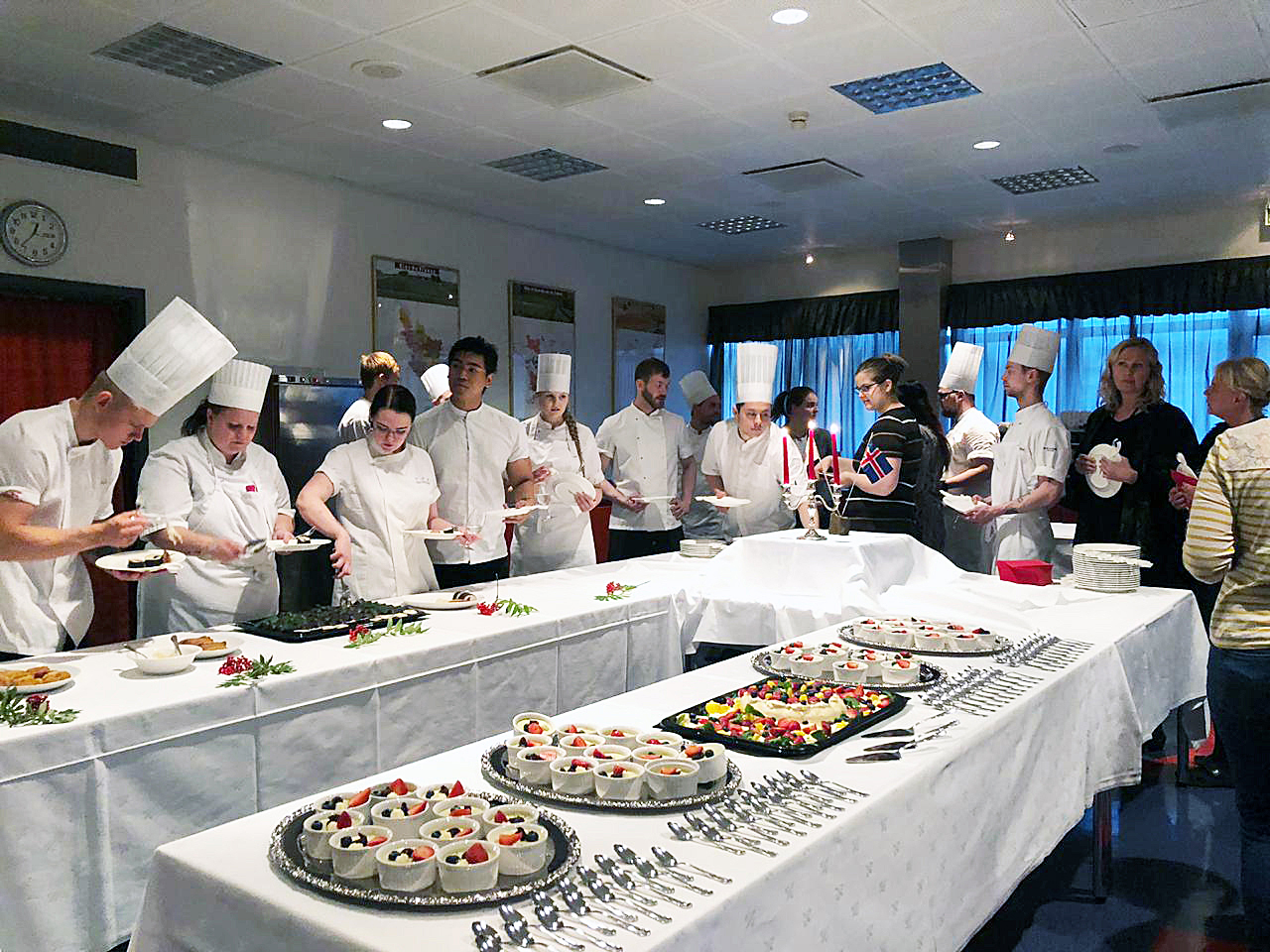 Þegar kennslu var lokið var afraksturinn borðaður af veisluborði.