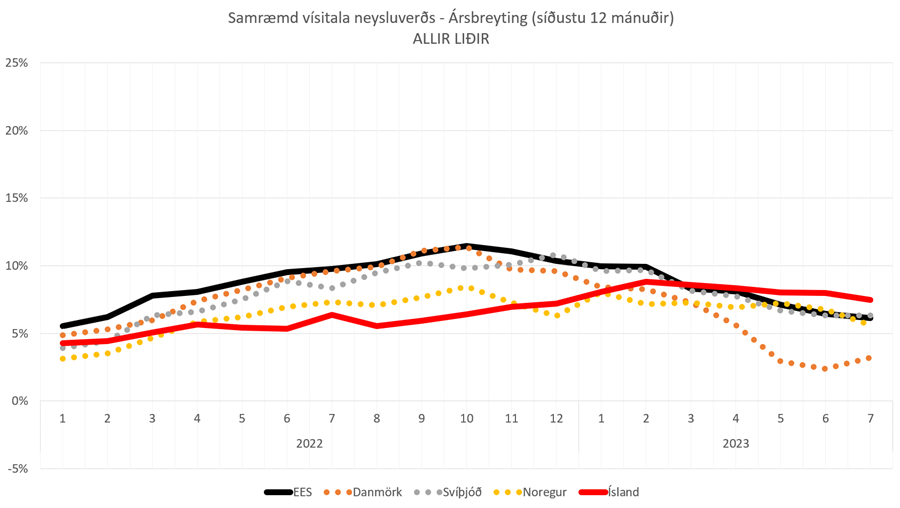 Mestu munar að eigið húsnæði er ekki með í samræmdu vísitölunni. Samkvæmt vísitölunni mælist 12 mánaða verðbólga í júlí 7,5% hér á landi en 6,1% innan EES svæðisins. Hér sést að hægt hefur á verðhækkunum erlendis á bæði kjöt-, mjólkur- og kornvörum á meðan verðbólgan á íslenskum matvörum sérstaklega hafði enn ekki byrjað að lækka þegar júlímælingar voru birtar. Hæst náði 12 mánaða verðbólga á matvörum tæplega 20% í Evrópu fyrri hluta þessa árs en féll svo hratt.
