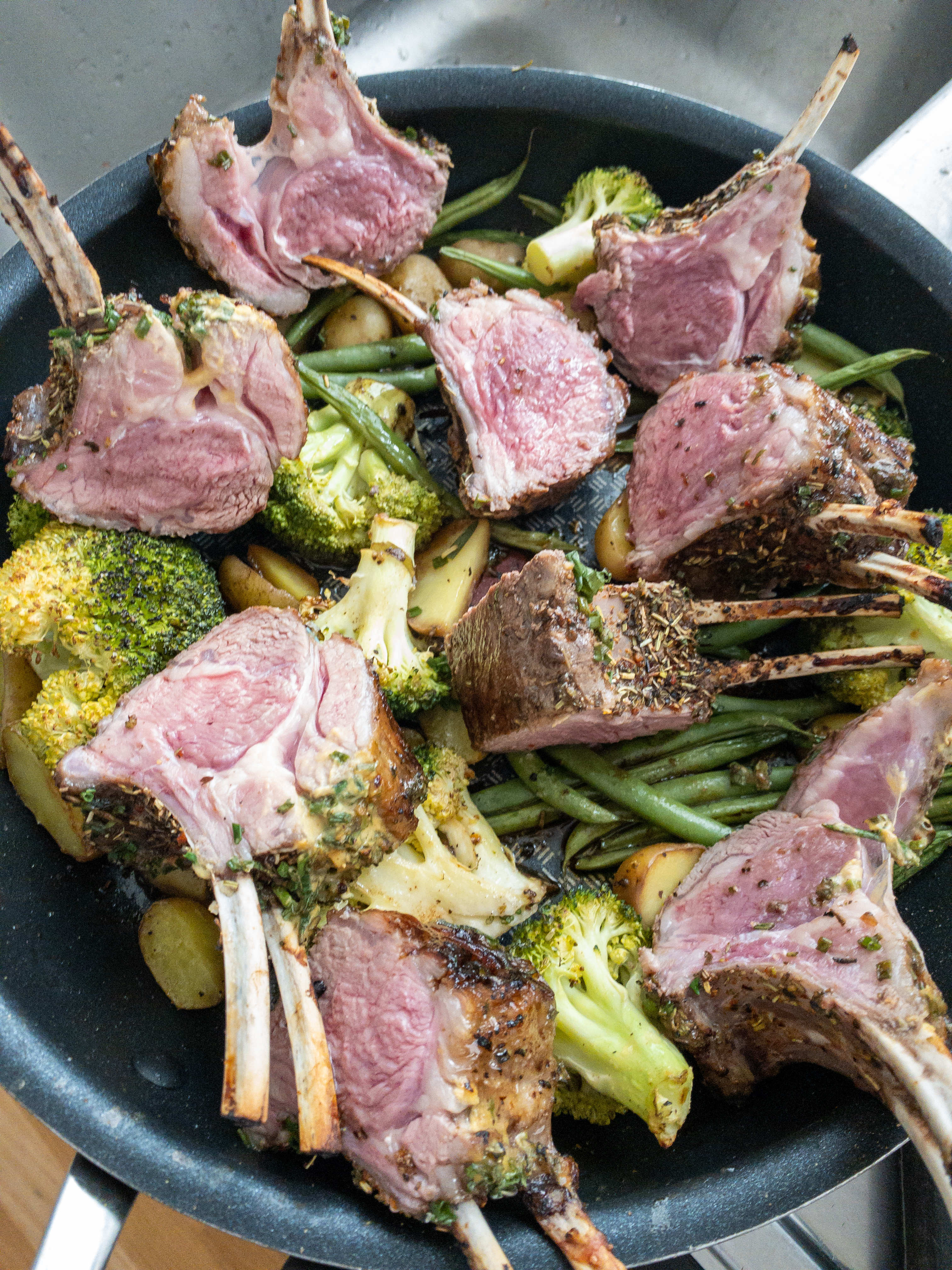 Setjið beinshliðina niður á pönnuna. Steikið lambið í forhituðum ofni í 12 til 18 mínútur, háð því hvernig þú vilt kjötið eldað. Með kjöthitamæli er gott að mæla eftir 10 til 12 mínútur og taka kjötið út, eða láta það eldast lengur, eftir þínum smekk.  Flestum finnst 63 gráður vera góður kjarnhiti fyrir bleikt kjöt. Hvílið kjötið í það minnsta í fimm til sjö mínútur áður en það er skorið á milli rifbeinanna.