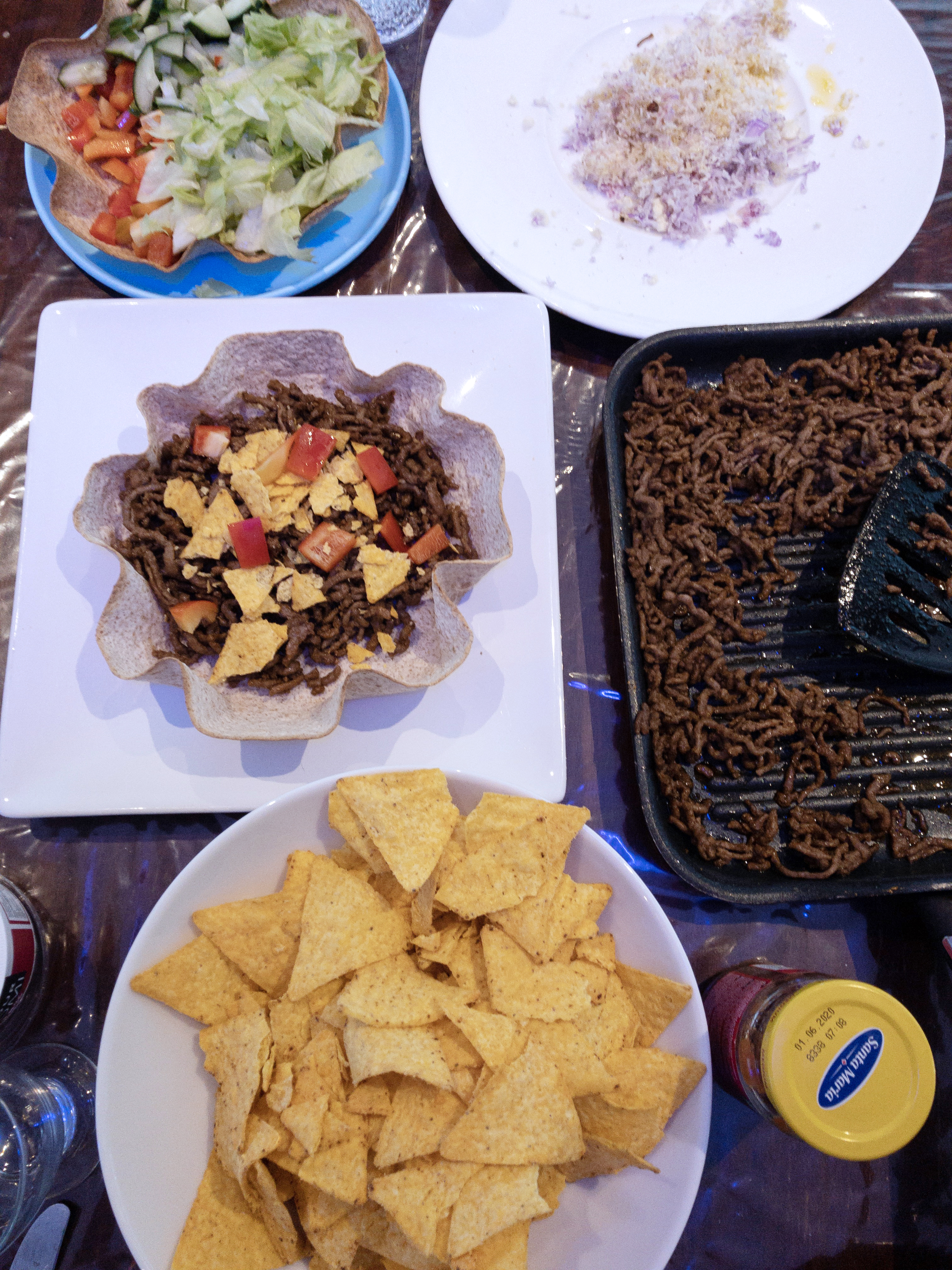 Framreiðið með meðlætinu, kjötblöndu, tómötum, osti, sýrðum rjóma.
