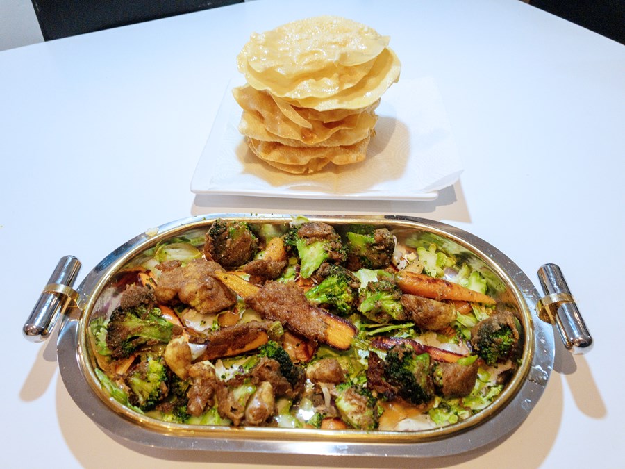 Berið fram annaðhvort raita (með kryddaðri jógúrtdýfu). Eða sem snakk með papadums sem er fljótlegt kex.