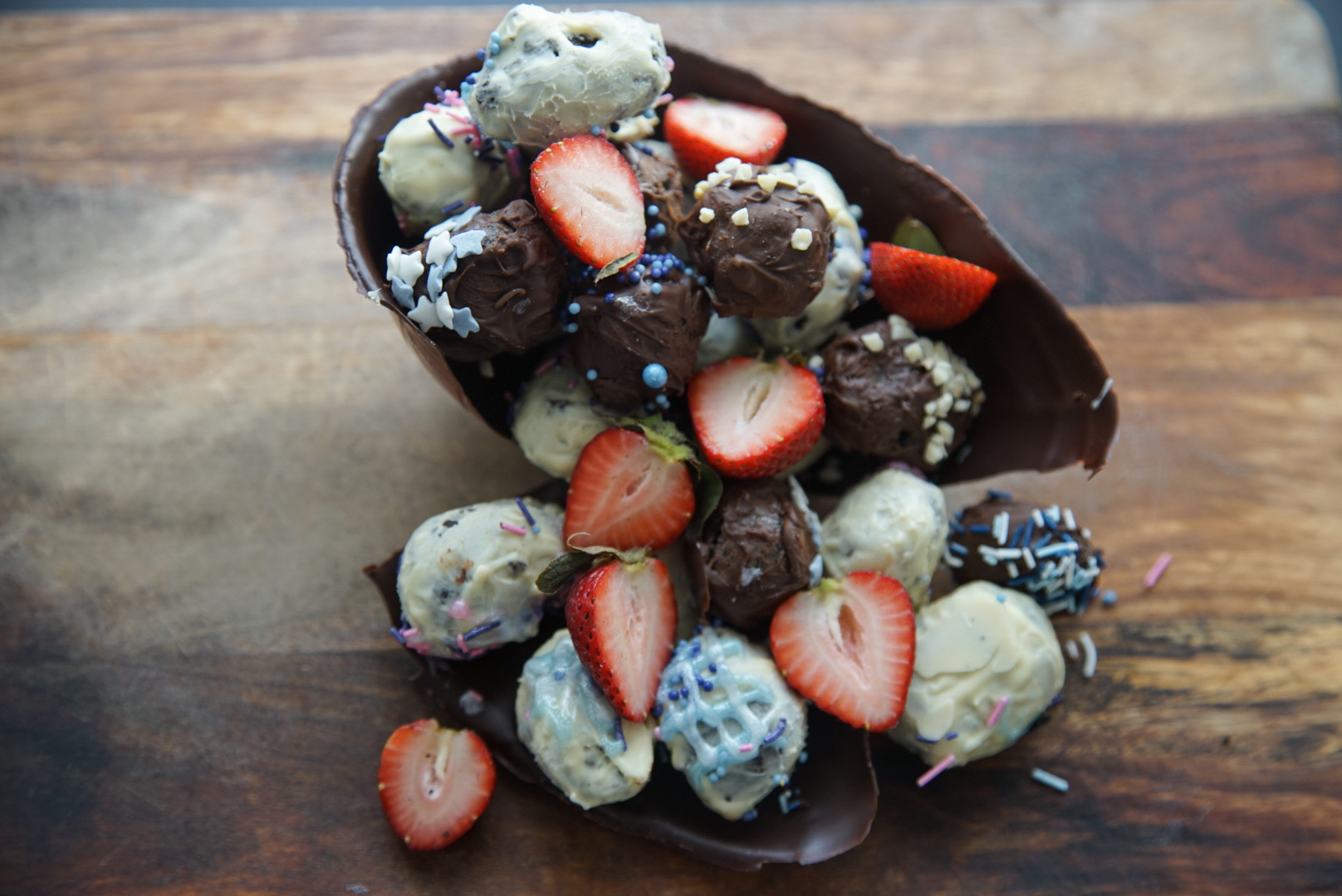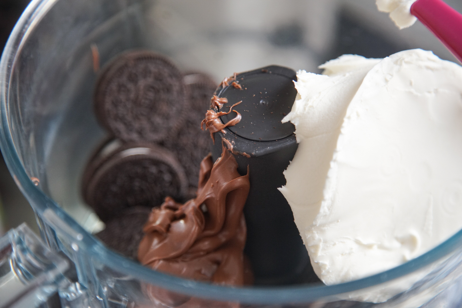 Myljið Oreo-kex í matvinnsluvél, með kreminu. Blandið Oreo-mylsnunni saman við rjómaostinn. Bætið einni skeið af Nutella saman við. Hnoðið deigið saman í egglaga bolta og setjið á smjörpappír. Setjið í frysti í 15 mínútur.