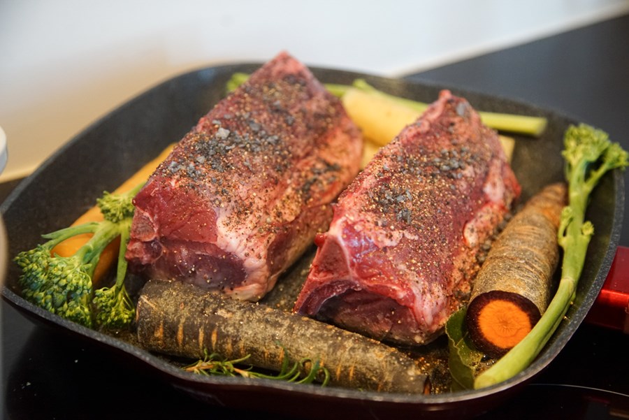 - Setjið kjötið á steikarpönnu. Brúnið á öllum hliðum.