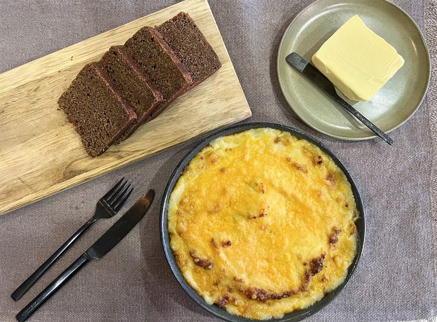Setjið blönduna í eldfast mót og stráið rifnum osti yfir, setjið í 180° C heitan ofn í 20 mínútur, eða þar til osturinn brúnast. Berið fram með rúgbrauði og smjöri.