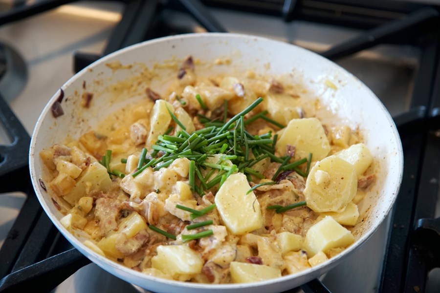 Graslaukurinn er farinn að vaxa. Það er til dæmis hægt að nota graslauk í gott kartöflusalat með pylsum. Jafnvel í heimagerðu smábrauði eða þeim gömlu góðu, en beikon og epli gefa þessu salati sérstakan karakter sem verður meira eins og kartöflurnar séu í aðalhlutverki í stað þess að vera bara meðlæti.