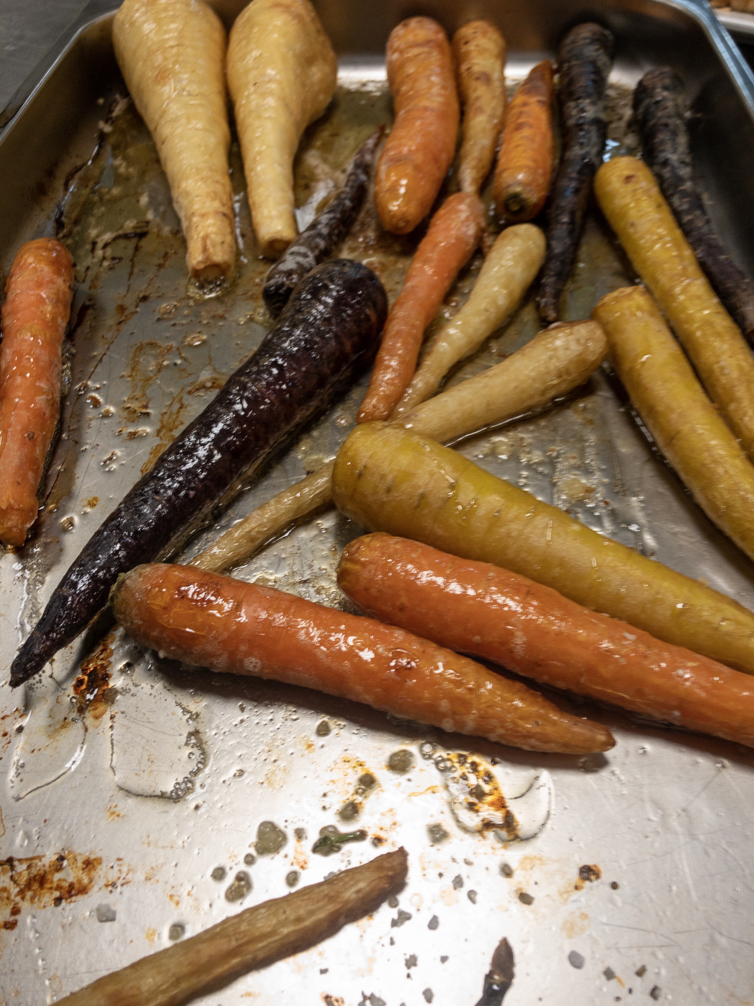 Eldum gulrætur, lauk, hvítlauk og kórianderfræ í olíu í ofni við vægan hita. Kryddum til með salti og pipar.