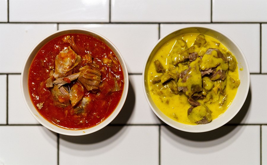 Kjötið er þá soðið við vægan hita í klukkutíma eða svo. Það er tilbúið þegar það dettur nokkuð auðveldlega af beininu. Á þessu stigi er hægt að fara með réttinn í margar áttir, búa til kæfu eða kjötsúpu. En það er ekki efni þessa pistils. Við ætlum að gera úr þessu eiturgult kjöt í karrí og kjöt í rauðri sósu sem er svo rauð að hún brennir hornhimnurnar ef ekki er farið varlega.