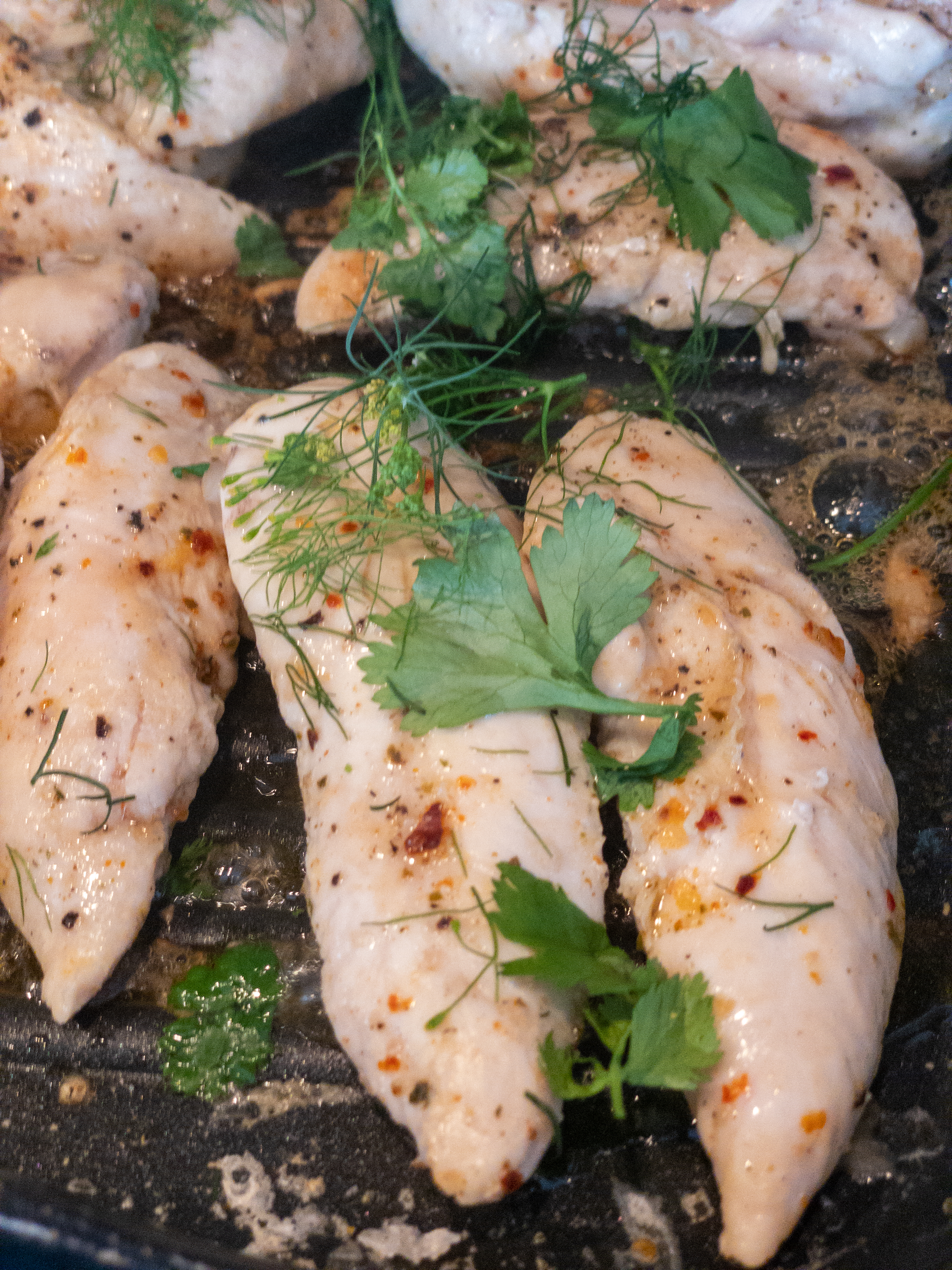 Setjið pönnu með ólífuolíu yfir miðlungs háan hita. Þegar pannan er heit, látið eitthvað af umfram marineringunni úr kjúklingnum á pönnuna. Eldið í u.þ.b. 2–3 mínútur á hvorri hlið, eða þar til þær eru orðnar fallega brúnaðar og eldaðar í gegn.