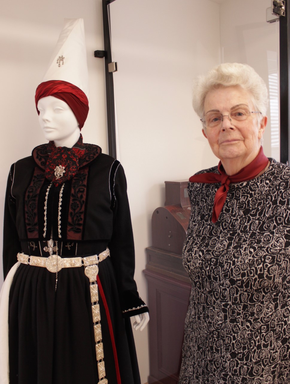 Jenný Karlsdóttir við faldbúning, elstu gerð íslenskra faldbúninga.