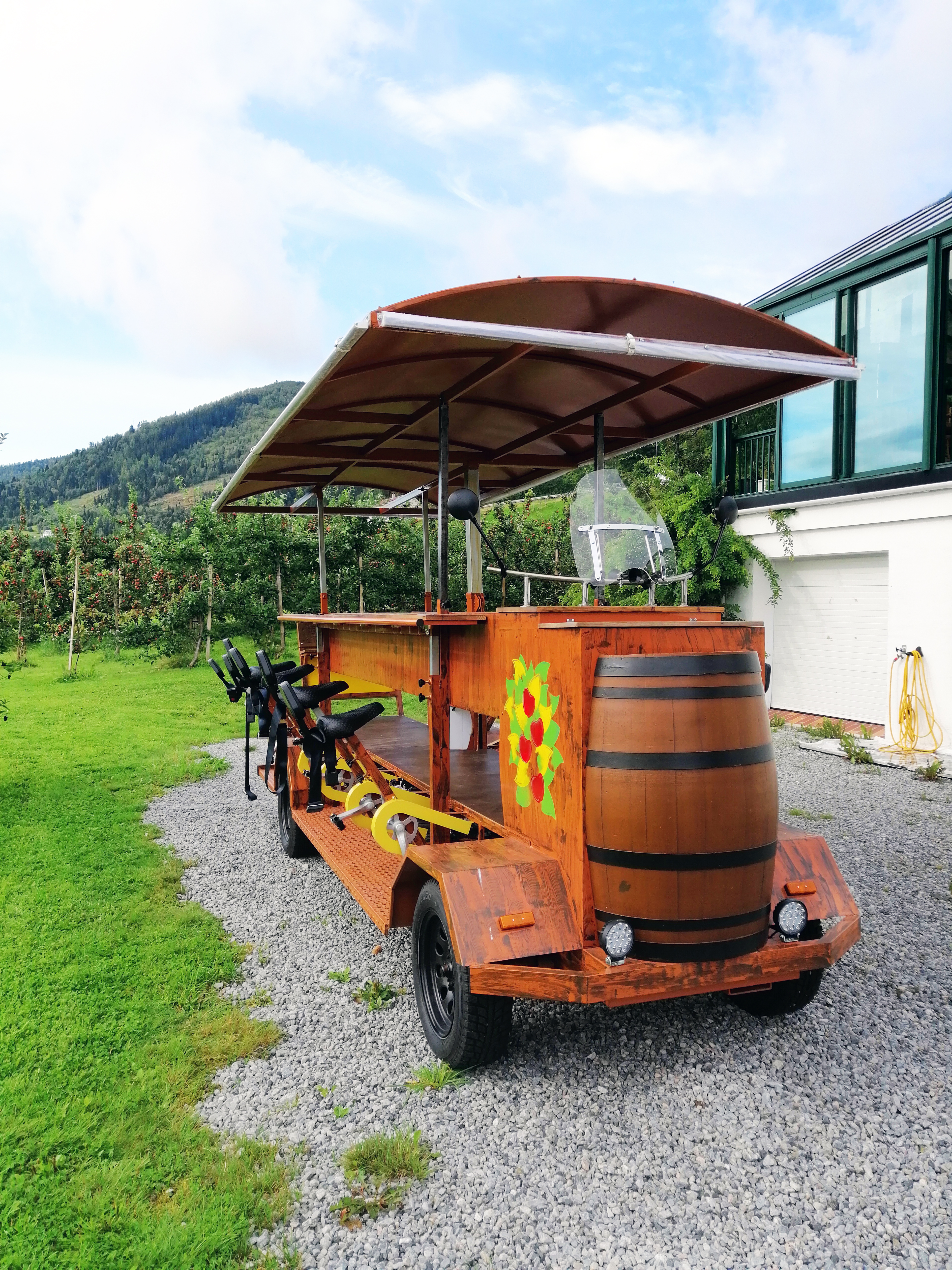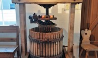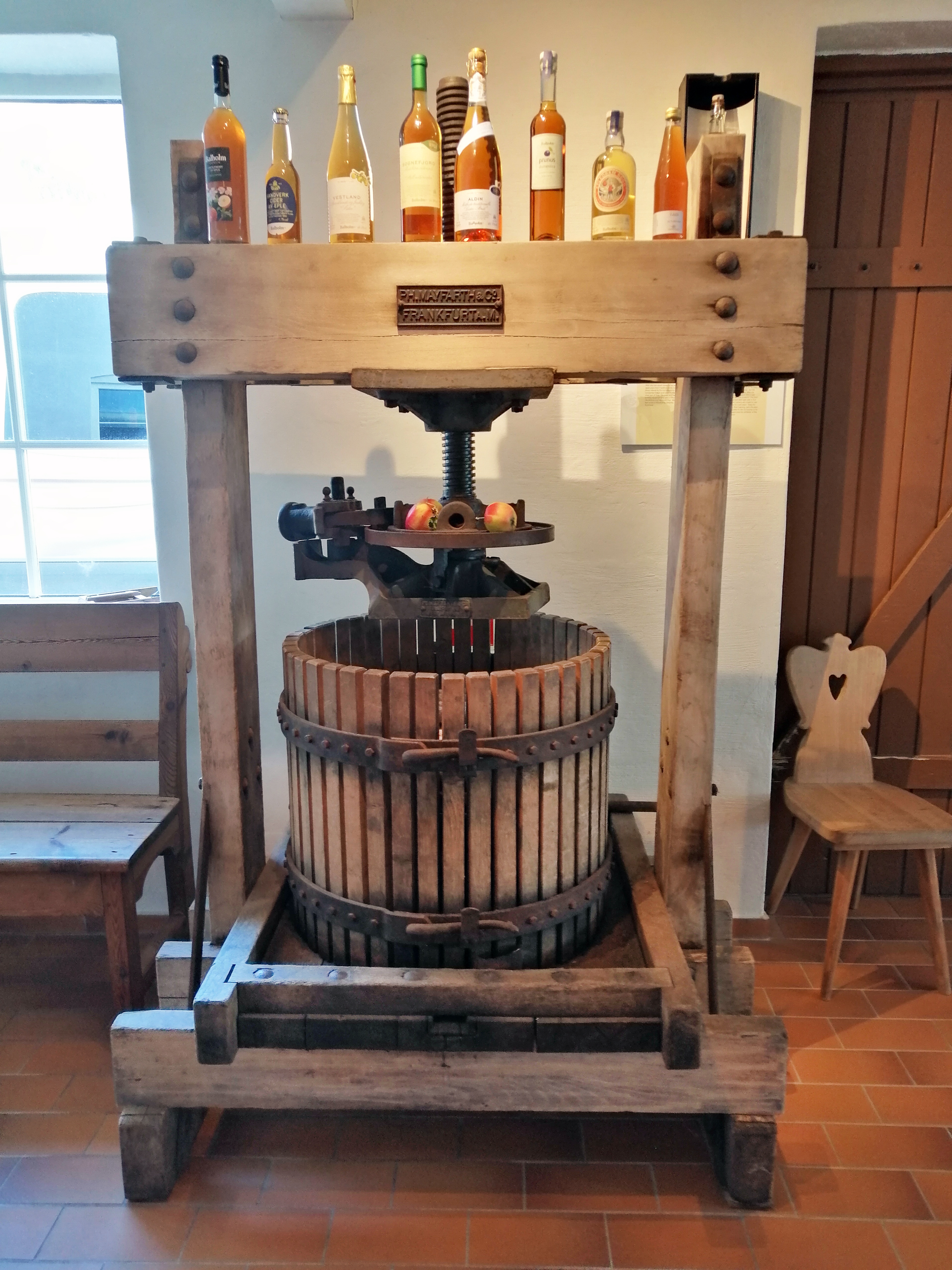 Gamalt eplapressunartæki sómir sér vel sem skraut og hilla í Ciderhuset.
