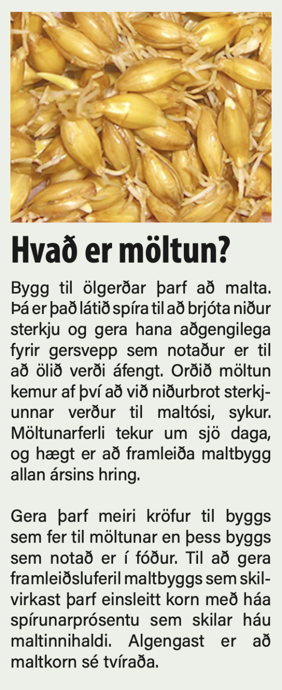 Ef vel gengur gætum við ræktað maltbygg fyrir allan innlendan markað en einnig aflað töluverðra útflutningstekna fyrir landið.“ Auk þess leita Luis og félagar hans að innlendum samstarfsaðilum við að fjármagna verkefnið. Honum reiknast til að innanlandsþörf fyrir maltbygg sé kringum 4.000 tonn á ári en út frá stærðarhagkvæmni sé lítið vit í öðru en byrja á malthúsi sem getur annað að minnsta kosti 60.000 tonnum á ári. Fjárfestingin yrði kringum 10 milljarðar króna.