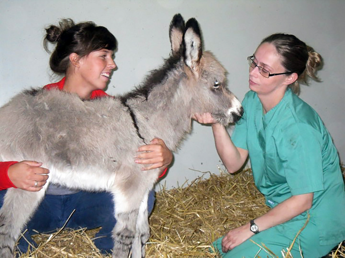 Í Evrópu er töluverður fjöldi asna haldnir sem gæludýr. Þeir eru mjög krefjandi sjúklingar og hafa sannarlega sína skoðun á hlutunum. Þarna er Helga að skoða asna sem kom inn til þeirra á hestaspítalann í Ghent.