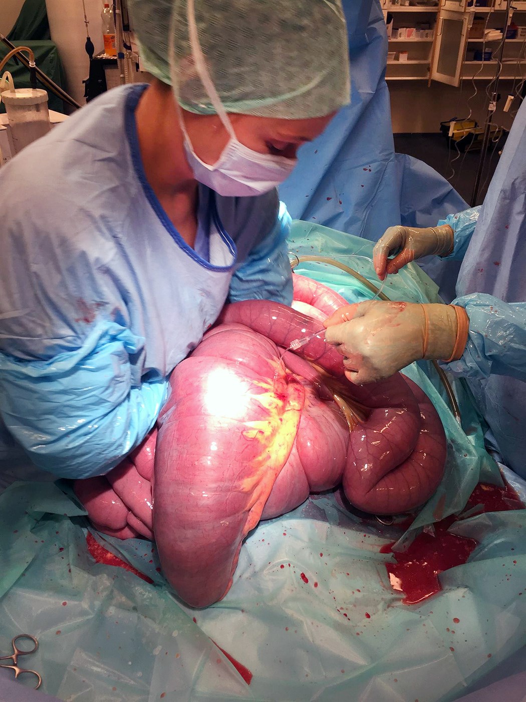 Helga vann í afleysingum á hestaspítala í Osló, Noregi sem heitir Bjerke. Á þessari mynd er hún að gera hrossasóttaruppskurð á Fjord-hesti sem kom inn til spítalans um miðja nótt. Hann var með snúning á víðgirni og stíflu í smáþörmum. Hesturinn náði sér að fullu.